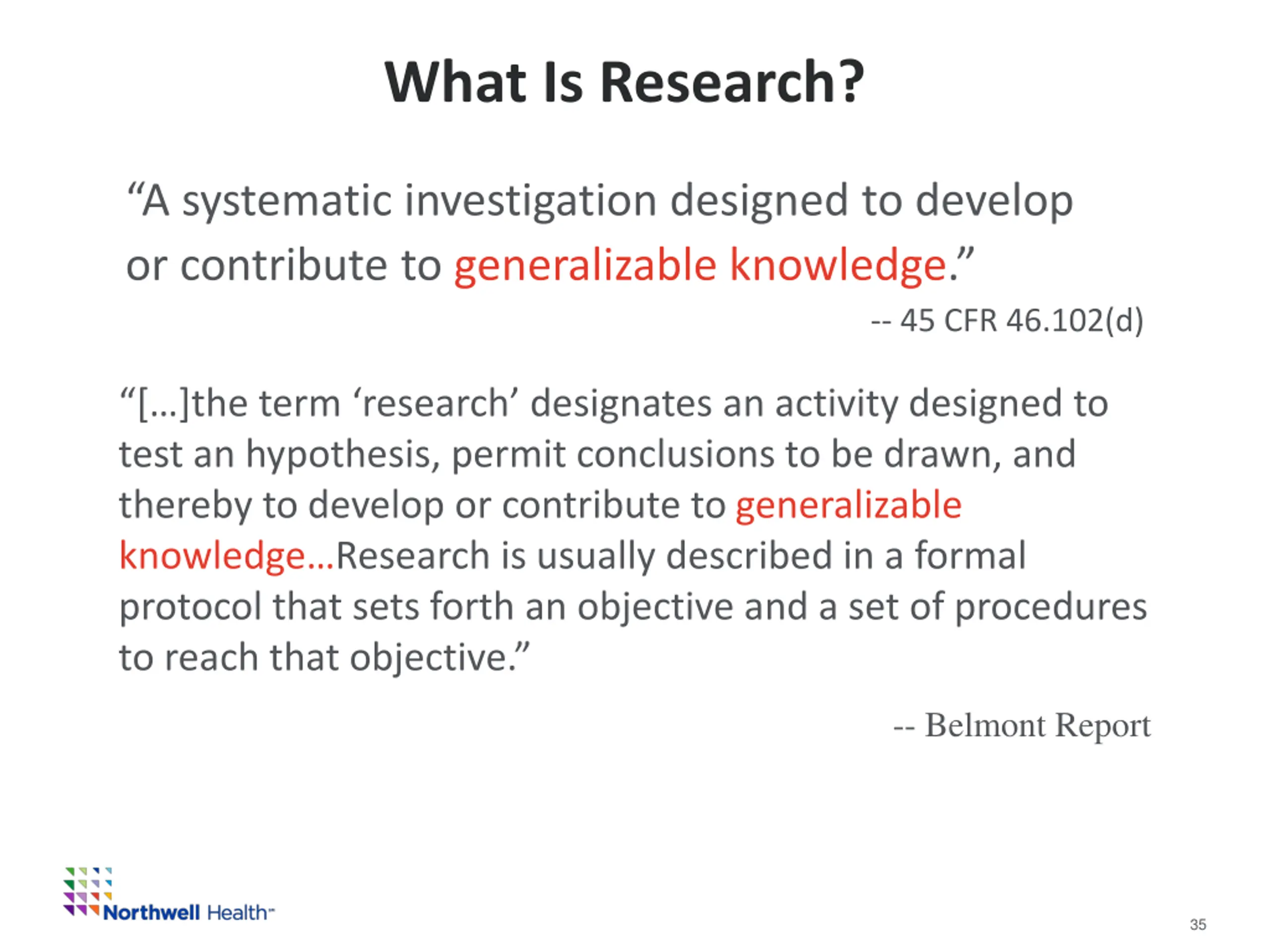 What Is Research? A systematic investigation designed to develop or contribute to generalizable knowledge. -- 45 CFR 46.102(d) [ ]the term research designates an activity designed to test an hypothesis, permit conclusions to be drawn, and thereby to develop or contribute to generalizable knowledge Research is usually described in a formal protocol that sets forth an objective and a set of procedures to reach that objective. -- Belmont Report 35