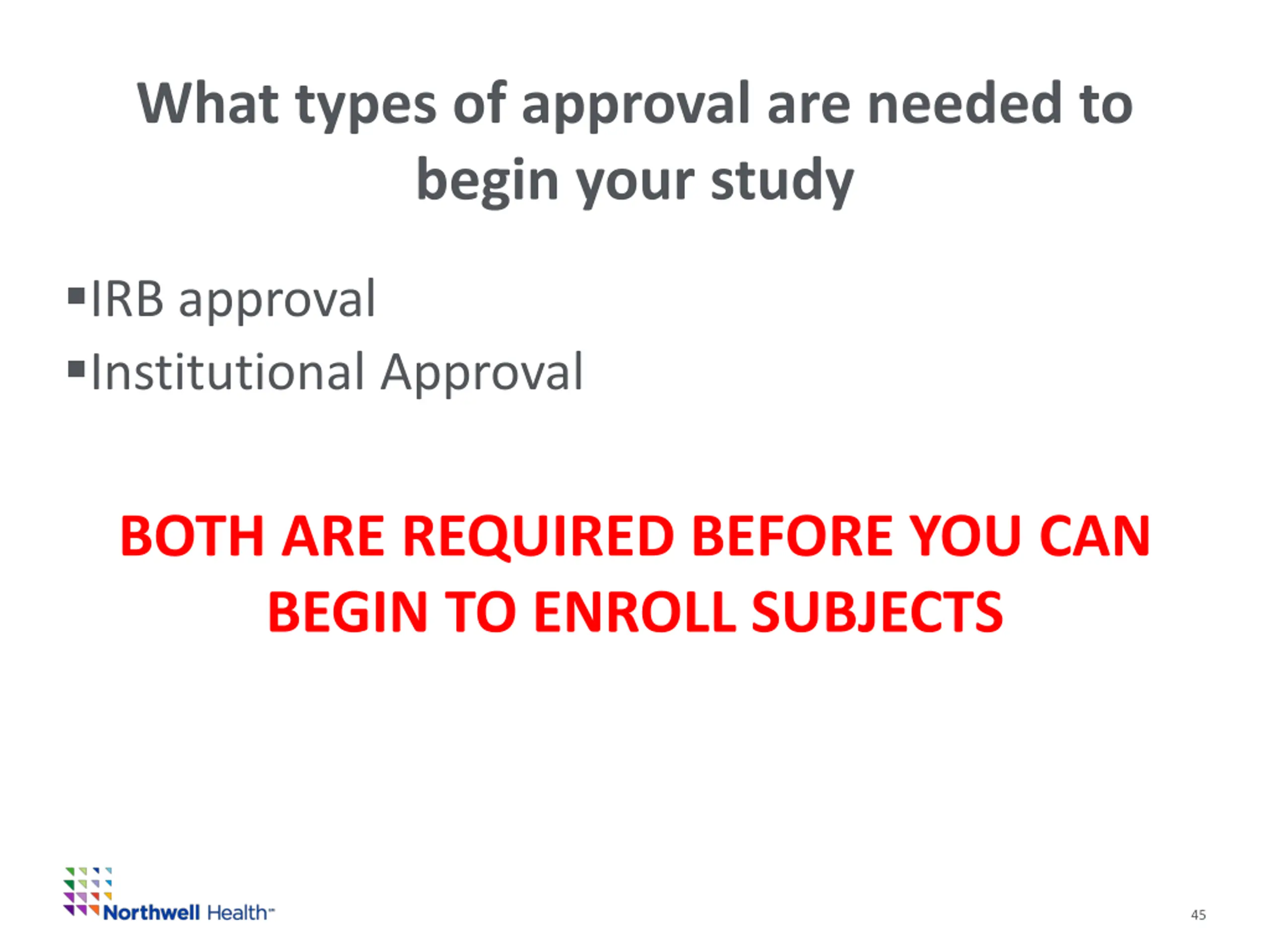 What types of approval are needed to begin your study IRB approval Institutional Approval BOTH ARE REQUIRED BEFORE YOU CAN BEGIN TO ENROLL SUBJECTS 45