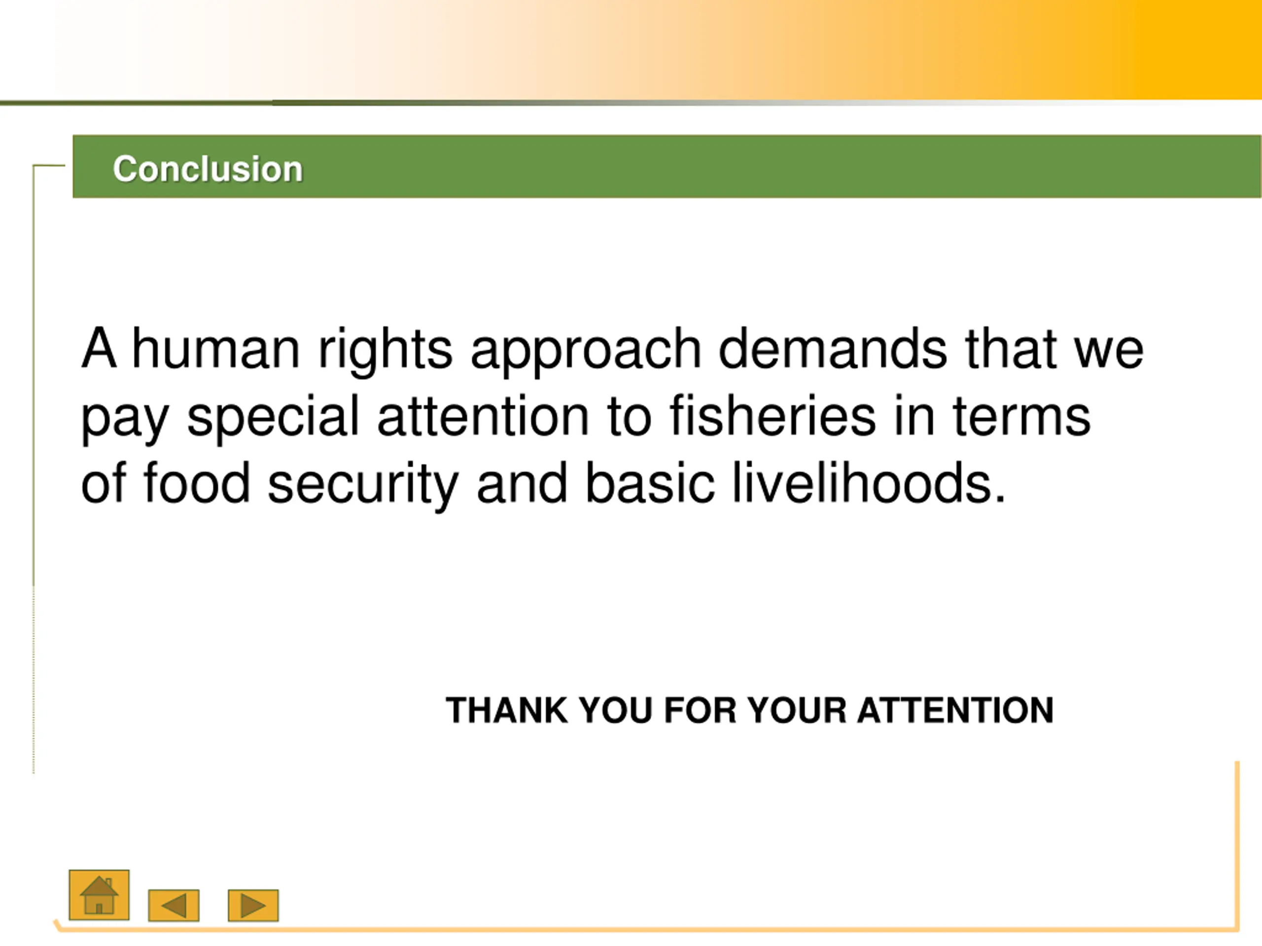 Conclusion A human rights approach demands that we pay special attention to fisheries in terms of food security and basic livelihoods. THANK YOU FOR YOUR ATTENTION