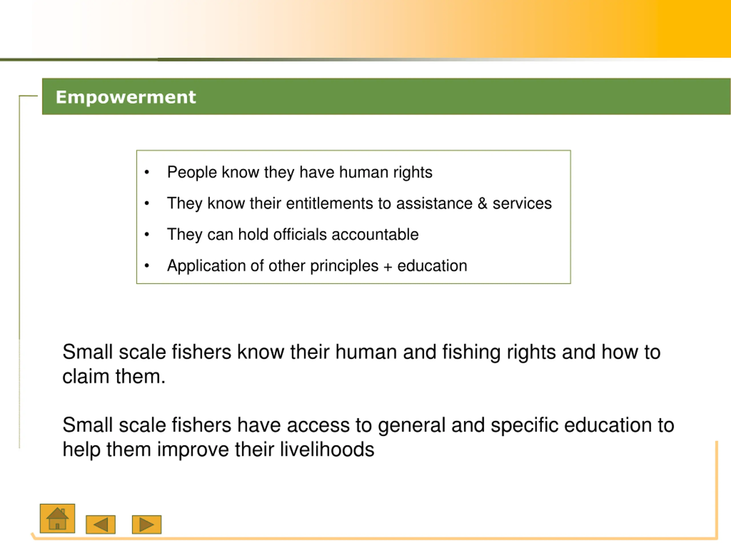Empowerment People know they have human rights They know their entitlements to assistance & services They can hold officials accountable Application of other principles + education Small scale fishers know their human and fishing rights and how to claim them. Small scale fishers have access to general and specific education to help them improve their livelihoods