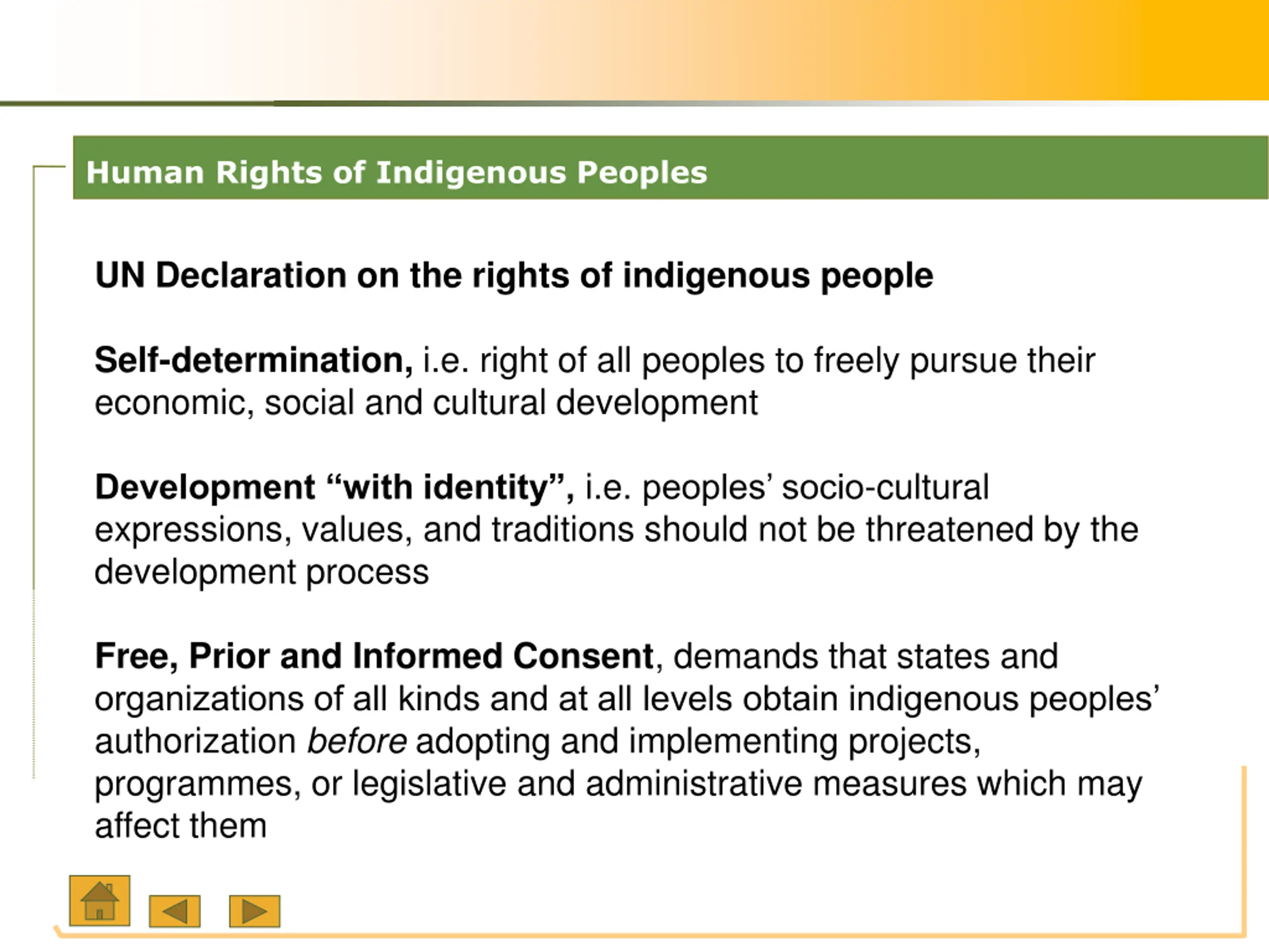 Human Rights of Indigenous Peoples UN Declaration on the rights of indigenous people Self-determination, i.e. right of all peoples to freely pursue their economic, social and cultural development Development with identity , i.e. peoples socio-cultural expressions, values, and traditions should not be threatened by the development process Free, Prior and Informed Consent, demands that states and organizations of all kinds and at all levels obtain indigenous peoples authorization before adopting and implementing projects, programmes, or legislative and administrative measures which may affect them