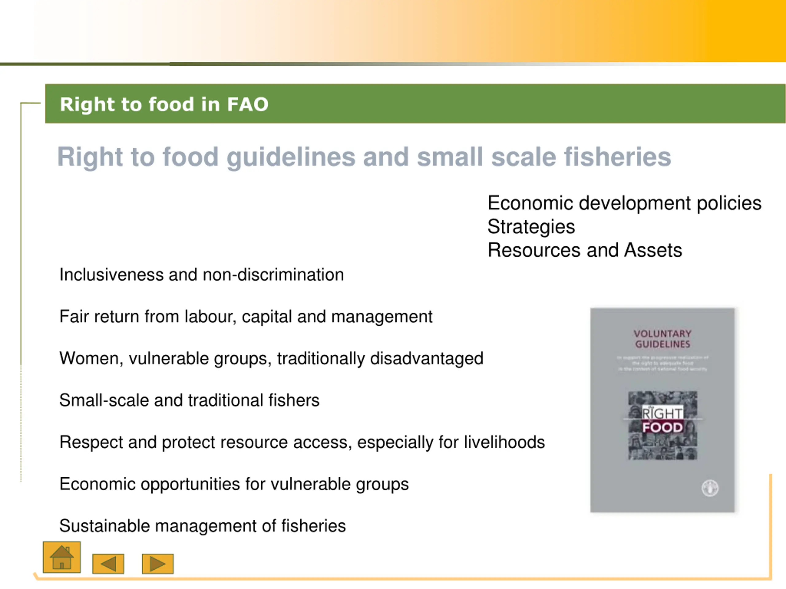Right to food in FAO Right to food guidelines and small scale fisheries Economic development policies Strategies Resources and Assets Inclusiveness and non-discrimination Fair return from labour, capital and management Women, vulnerable groups, traditionally disadvantaged Small-scale and traditional fishers Respect and protect resource access, especially for livelihoods Economic opportunities for vulnerable groups Sustainable management of fisheries