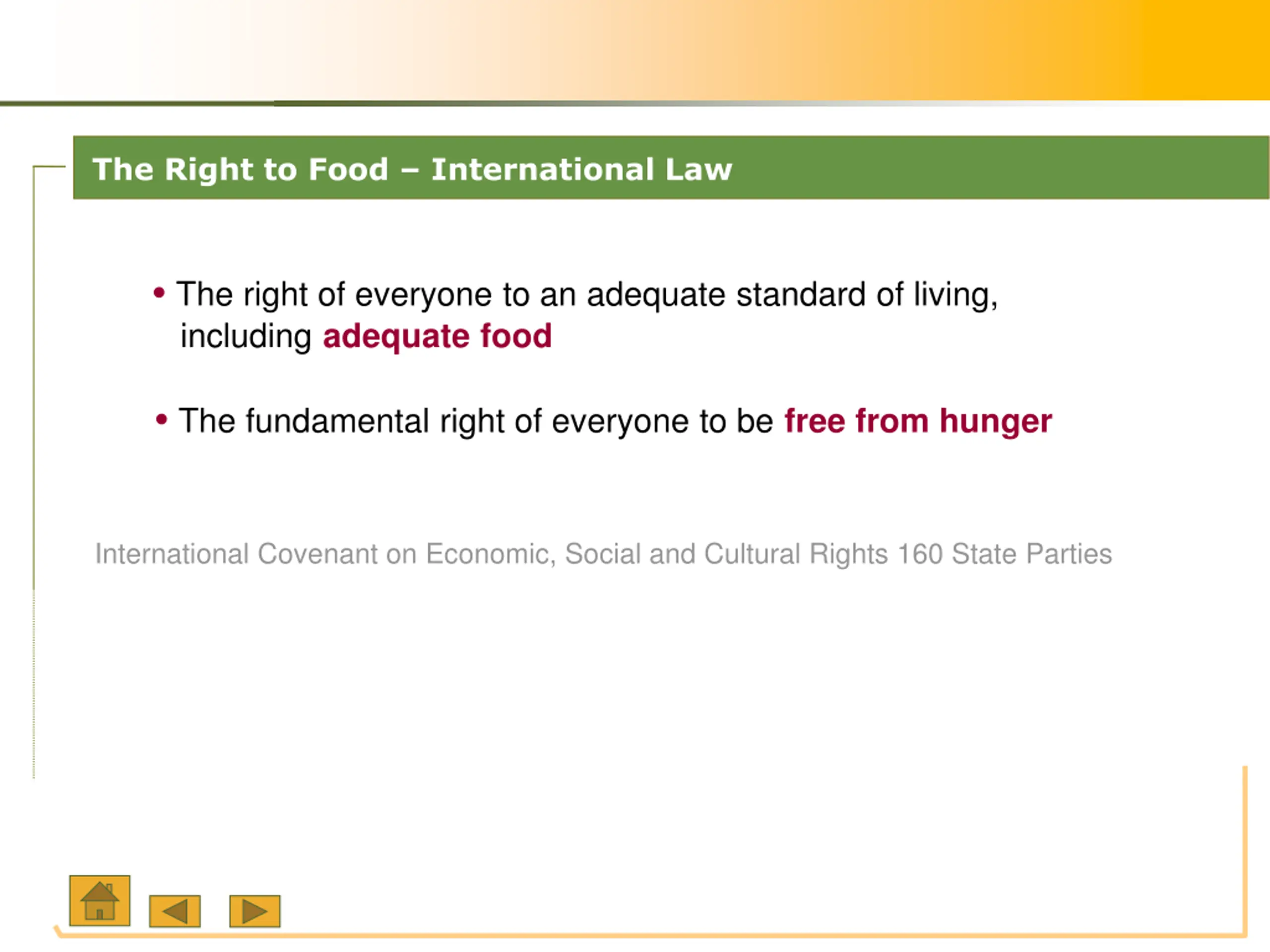 The Right to Food International Law The right of everyone to an adequate standard of living, including adequate food The fundamental right of everyone to be free from hunger International Covenant on Economic, Social and Cultural Rights 160 State Parties