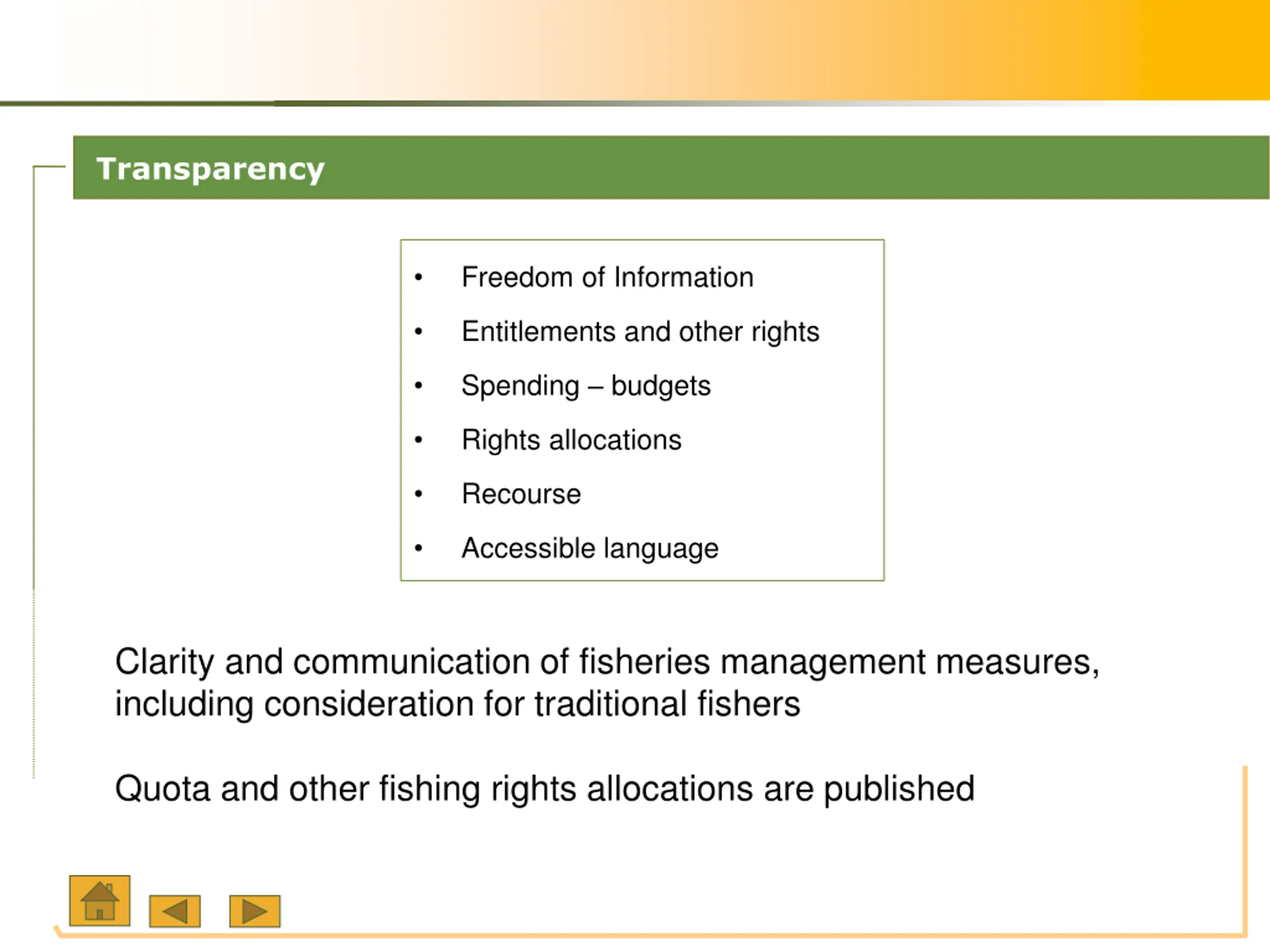 Transparency Freedom of Information Entitlements and other rights Spending budgets Rights allocations Recourse Accessible language Clarity and communication of fisheries management measures, including consideration for traditional fishers Quota and other fishing rights allocations are published