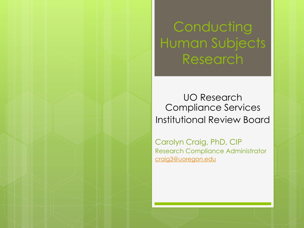 Conducting Human Subjects Research UO Research Compliance Services Institutional Review Board Carolyn Craig, PhD, CIP Research Compliance Administrator craig3@uoregon.edu