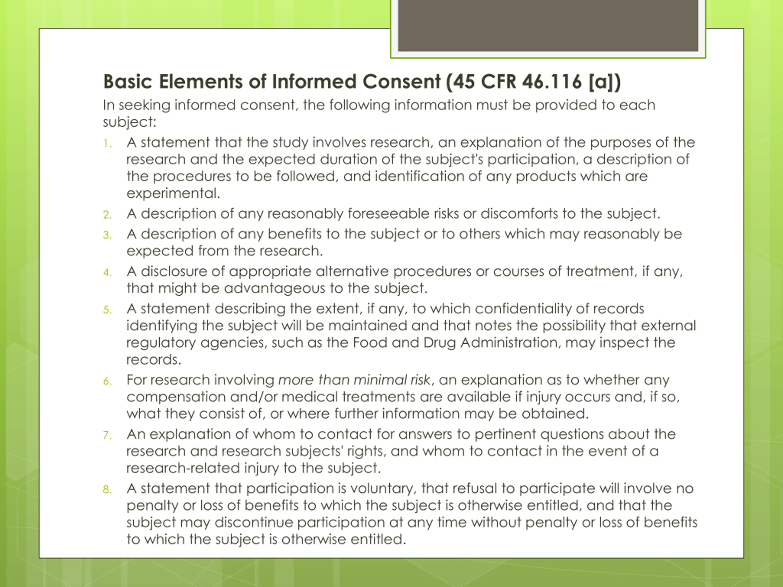 Basic Elements of Informed Consent (45 CFR 46.116 [a]) In seeking informed consent, the following information must be provided to each subject: A statement that the study involves research, an explanation of the purposes of the research and the expected duration of the subject's participation, a description of the procedures to be followed, and identification of any products which are experimental. A description of any reasonably foreseeable risks or discomforts to the subject. A description of any benefits to the subject or to others which may reasonably be expected from the research. A disclosure of appropriate alternative procedures or courses of treatment, if any, that might be advantageous to the subject. A statement describing the extent, if any, to which confidentiality of records identifying the subject will be maintained and that notes the possibility that external regulatory agencies, such as the Food and Drug Administration, may inspect the records. For research involving more than minimal risk, an explanation as to whether any compensation and/or medical treatments are available if injury occurs and, if so, what they consist of, or where further information may be obtained. An explanation of whom to contact for answers to pertinent questions about the research and research subjects' rights, and whom to contact in the event of a research-related injury to the subject. A statement that participation is voluntary, that refusal to participate will involve no penalty or loss of benefits to which the subject is otherwise entitled, and that the subject may discontinue participation at any time without penalty or loss of benefits to which the subject is otherwise entitled. 1. 2. 3. 4. 5. 6. 7. 8.