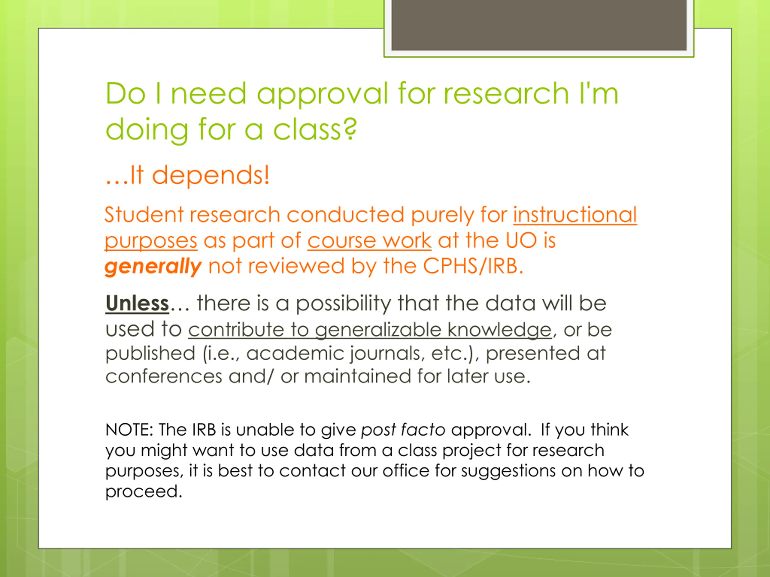 Do I need approval for research I'm doing for a class? It depends! Student research conducted purely for instructional purposes as part of course work at the UO is generally not reviewed by the CPHS/IRB. Unless there is a possibility that the data will be used to contribute to generalizable knowledge, or be published (i.e., academic journals, etc.), presented at conferences and/ or maintained for later use. NOTE: The IRB is unable to give post facto approval. If you think you might want to use data from a class project for research purposes, it is best to contact our office for suggestions on how to proceed.