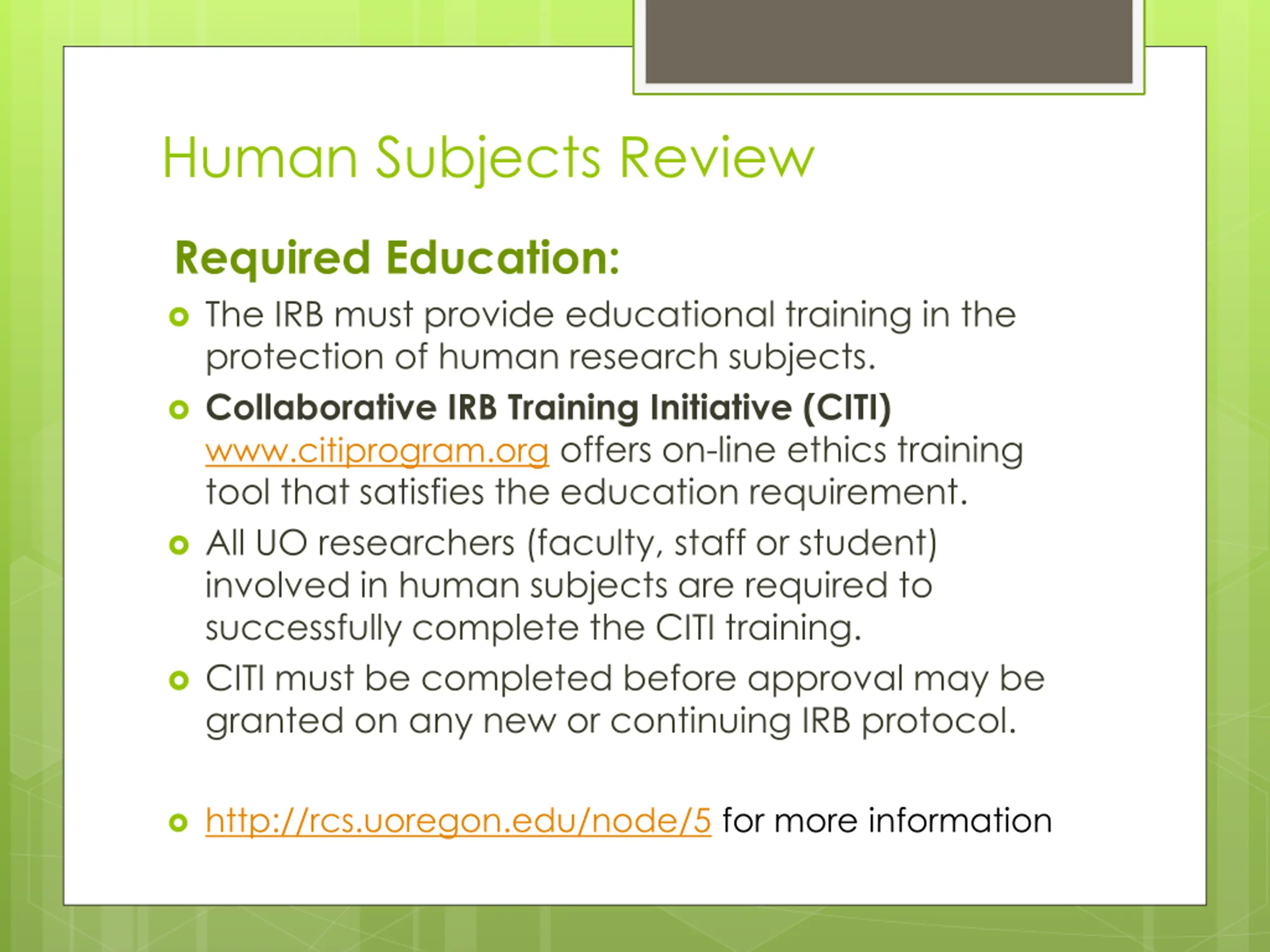 Human Subjects Review Required Education: The IRB must provide educational training in the protection of human research subjects. Collaborative IRB Training Initiative (CITI) www.citiprogram.org offers on-line ethics training tool that satisfies the education requirement. All UO researchers (faculty, staff or student) involved in human subjects are required to successfully complete the CITI training. CITI must be completed before approval may be granted on any new or continuing IRB protocol. http://rcs.uoregon.edu/node/5 for more information