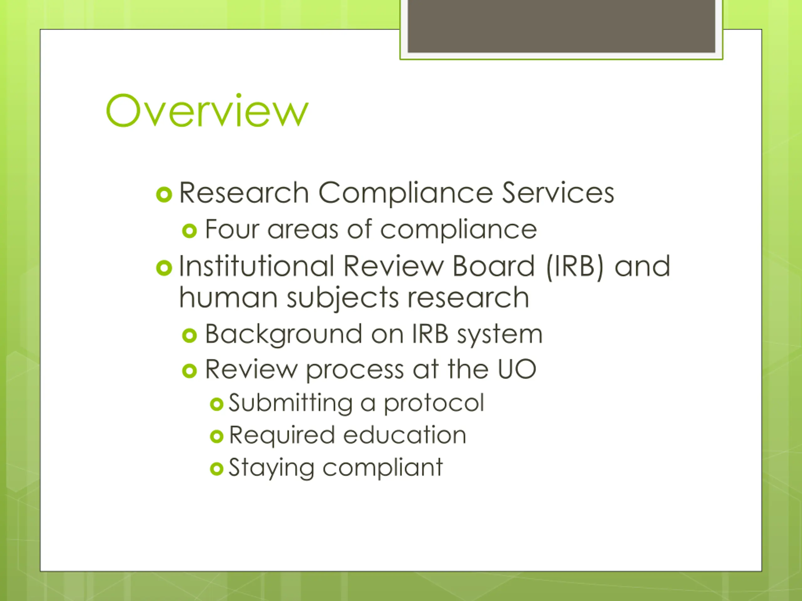 Overview Research Compliance Services Four areas of compliance Institutional Review Board (IRB) and human subjects research Background on IRB system Review process at the UO Submitting a protocol Required education Staying compliant
