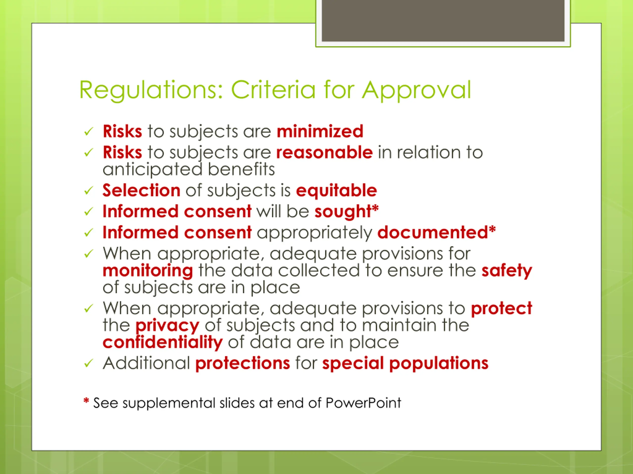 Regulations: Criteria for Approval Risks to subjects are minimized Risks to subjects are reasonable in relation to anticipated benefits Selection of subjects is equitable Informed consent will be sought* Informed consent appropriately documented* When appropriate, adequate provisions for monitoring the data collected to ensure the safety of subjects are in place When appropriate, adequate provisions to protect the privacy of subjects and to maintain the confidentiality of data are in place Additional protections for special populations * See supplemental slides at end of PowerPoint