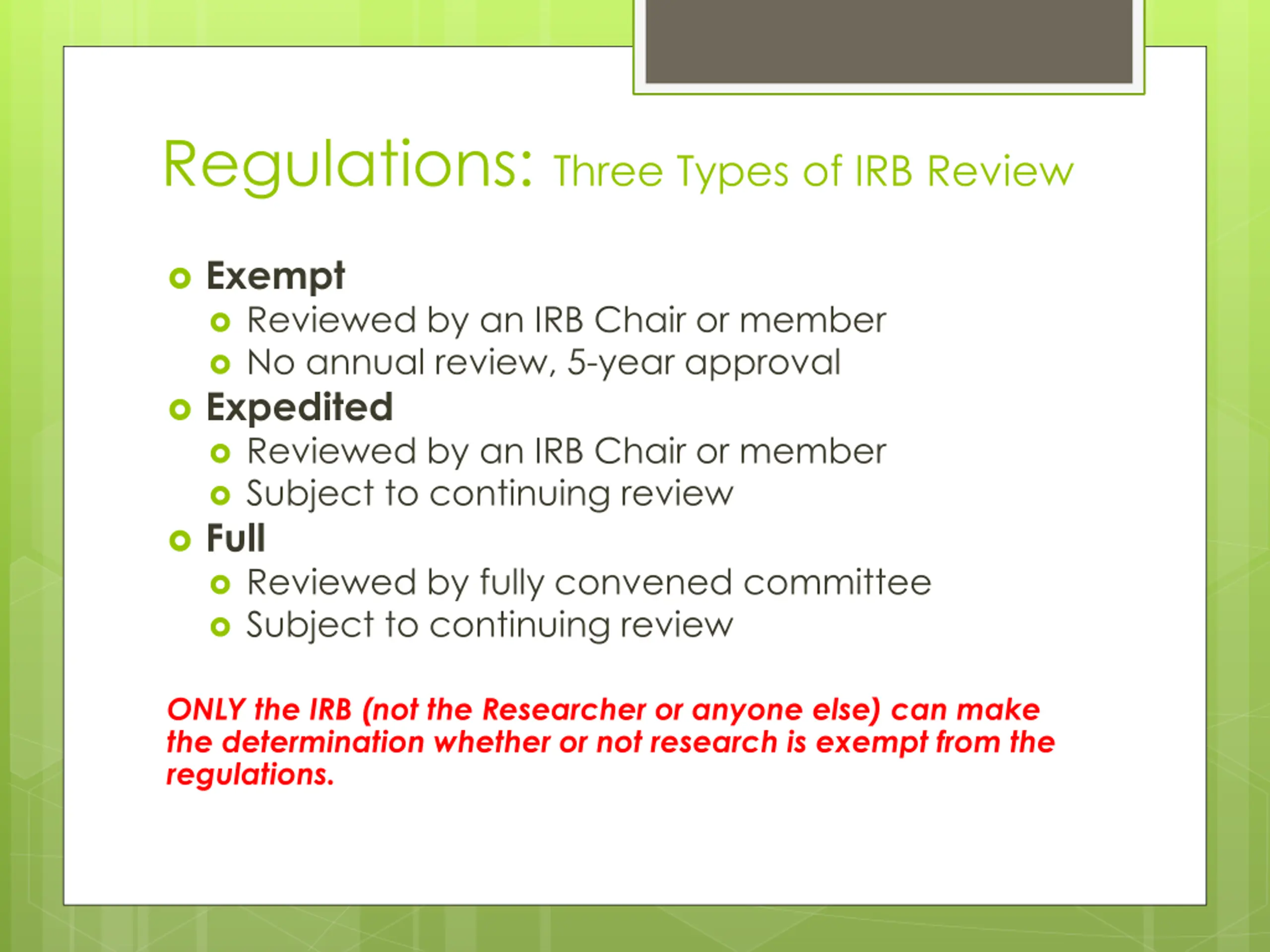 Regulations: Three Types of IRB Review Exempt Reviewed by an IRB Chair or member No annual review, 5-year approval Expedited Reviewed by an IRB Chair or member Subject to continuing review Full Reviewed by fully convened committee Subject to continuing review ONLY the IRB (not the Researcher or anyone else) can make the determination whether or not research is exempt from the regulations.