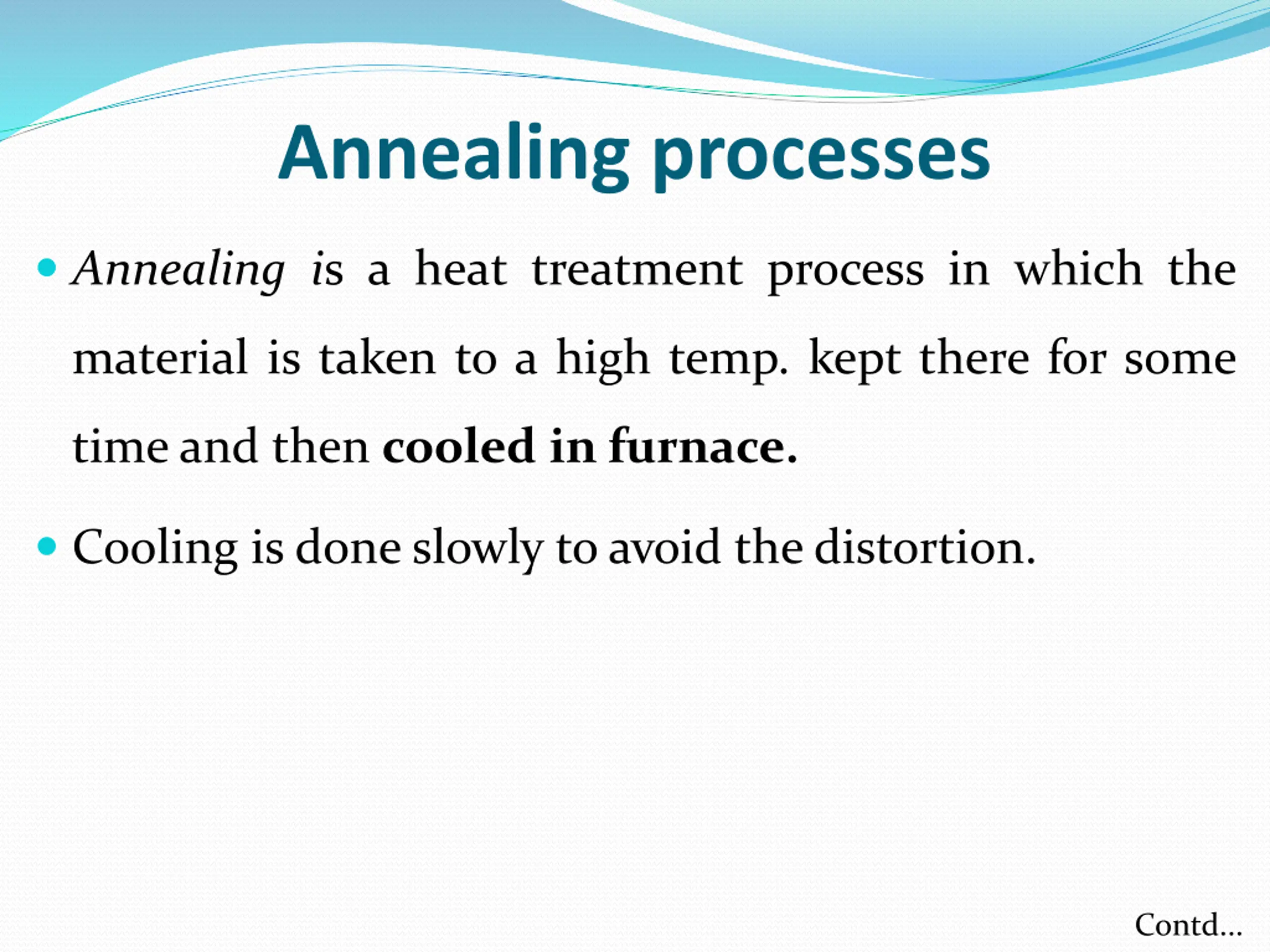 Annealing processes Annealing is a heat treatment process in which the material is taken to a high temp. kept there for some time and then cooled in furnace. Cooling is done slowly to avoid the distortion. Contd...
