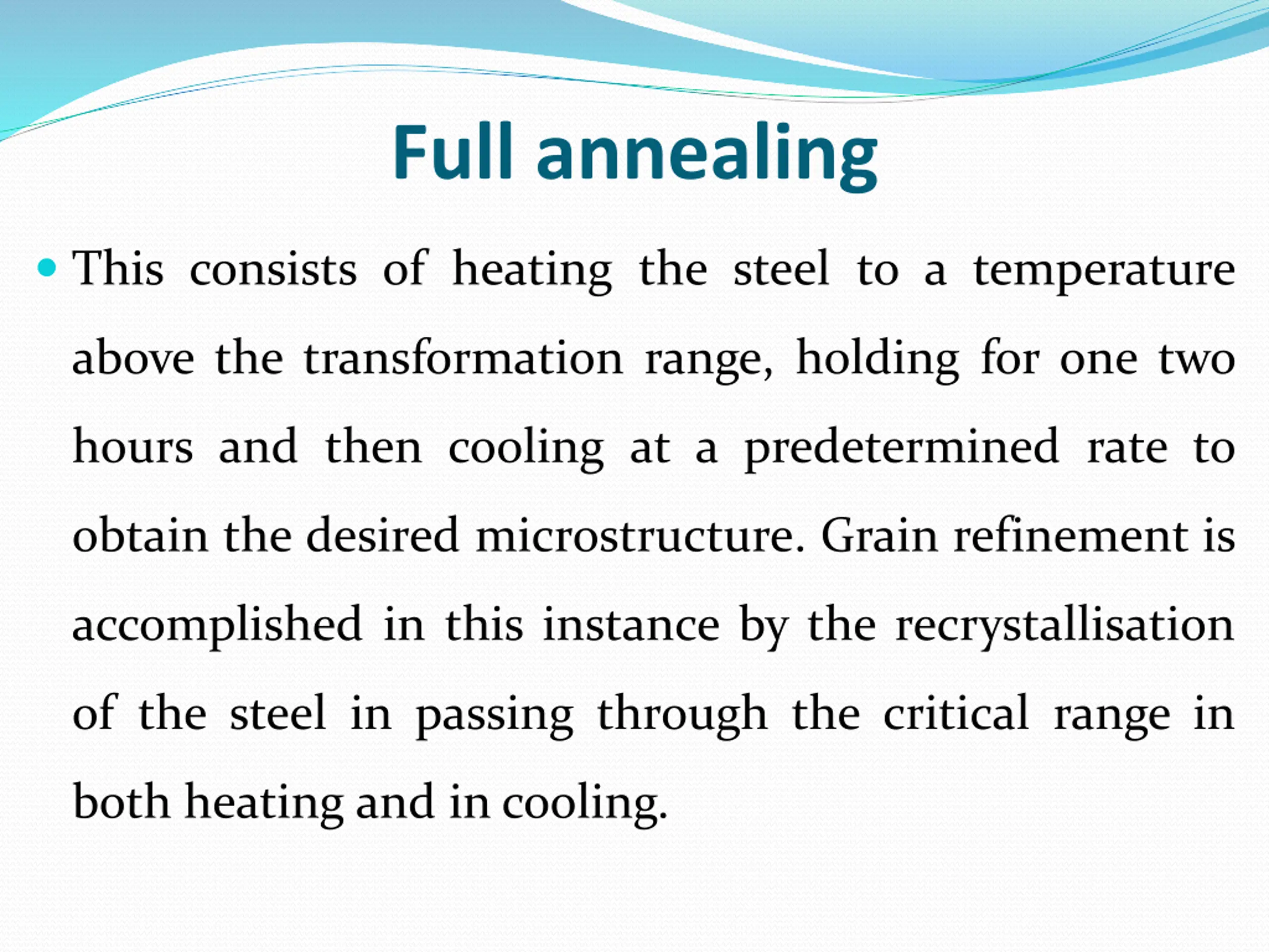 Full annealing This consists of heating the steel to a temperature above the transformation range, holding for one two hours and then cooling at a predetermined rate to obtain the desired microstructure. Grain refinement is accomplished in this instance by the recrystallisation of the steel in passing through the critical range in both heating and in cooling.