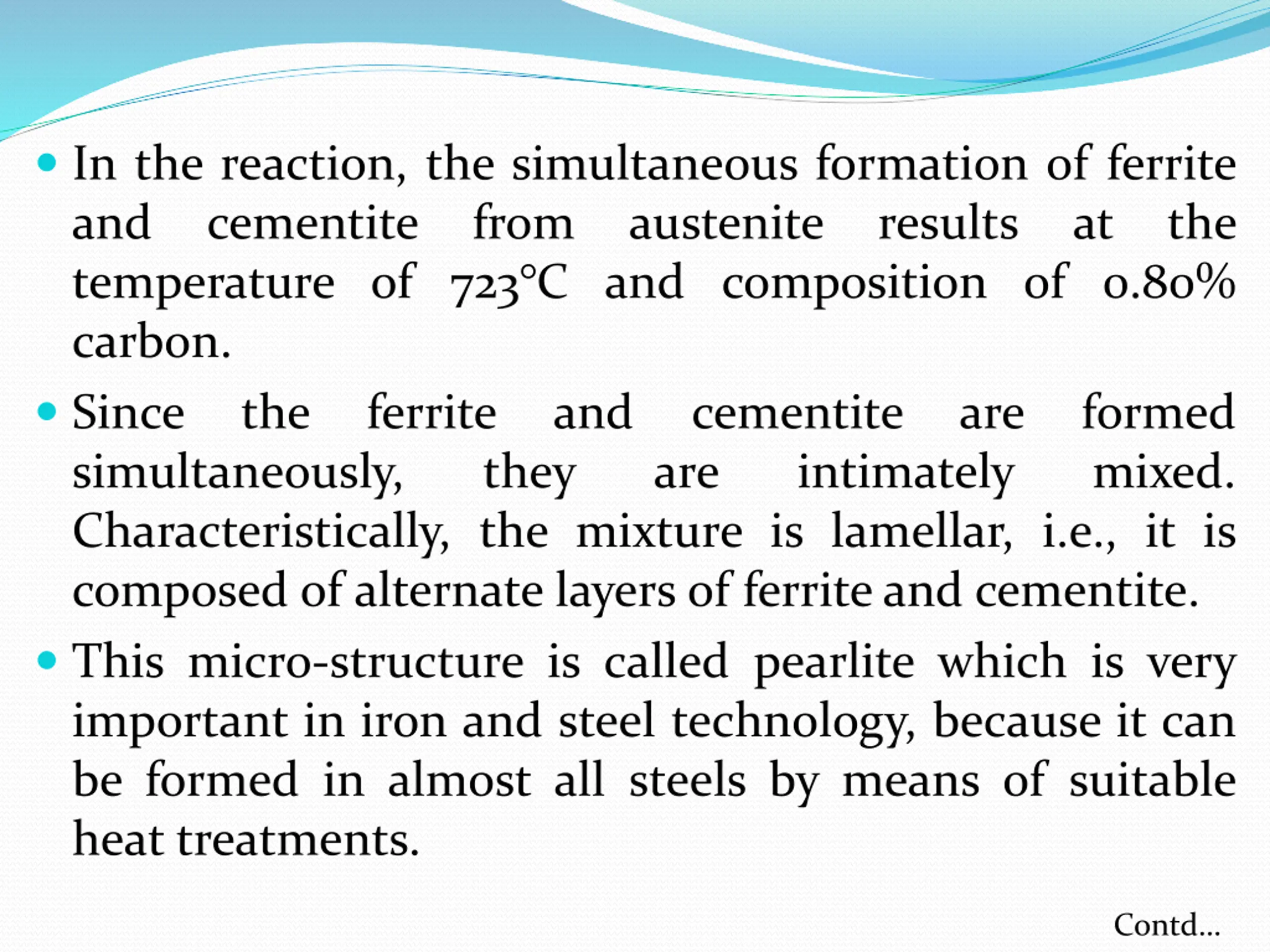 In the reaction, the simultaneous formation of ferrite and cementite from austenite results at the temperature of 723 C and composition of 0.80% carbon. Since the ferrite and simultaneously, they Characteristically, the mixture is lamellar, i.e., it is composed of alternate layers of ferrite and cementite. This micro-structure is called pearlite which is very important in iron and steel technology, because it can be formed in almost all steels by means of suitable heat treatments. cementite are are formed mixed. intimately Contd