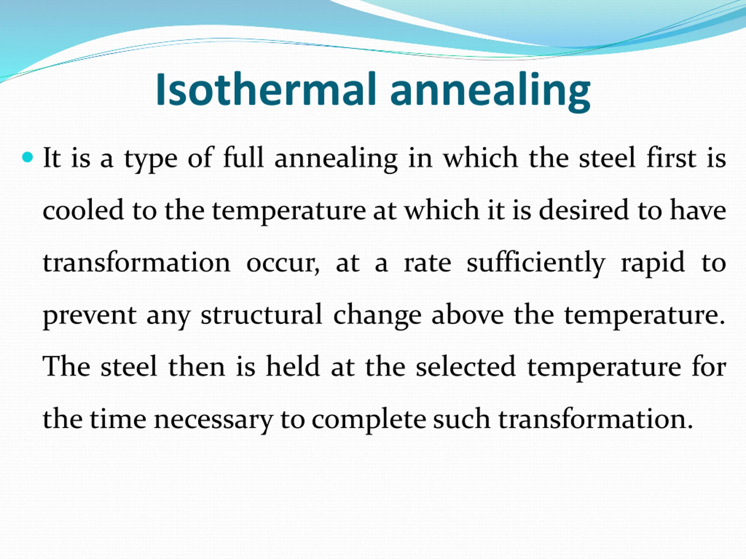 Isothermal annealing It is a type of full annealing in which the steel first is cooled to the temperature at which it is desired to have transformation occur, at a rate sufficiently rapid to prevent any structural change above the temperature. The steel then is held at the selected temperature for the time necessary to complete such transformation.