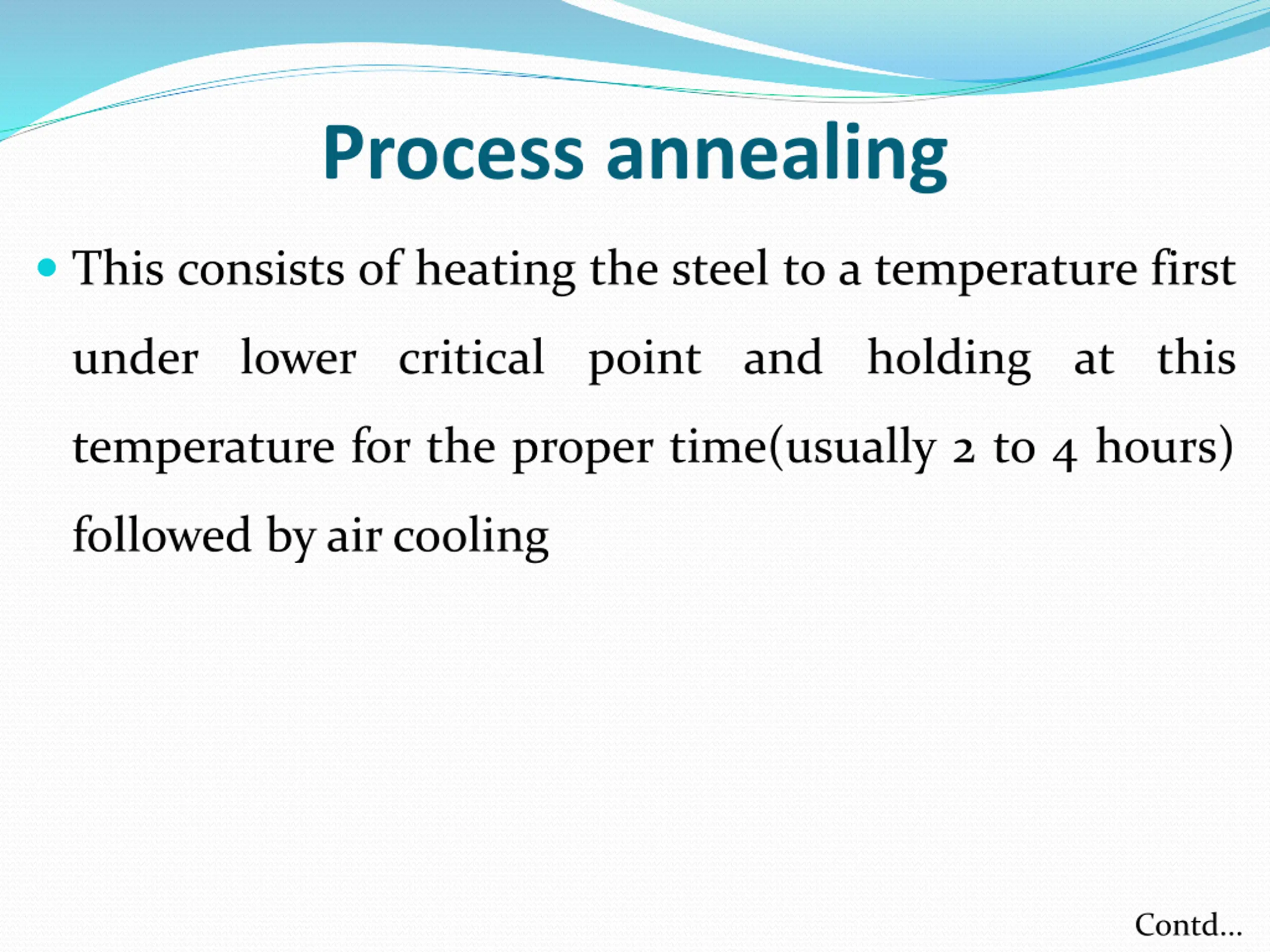 Process annealing This consists of heating the steel to a temperature first under lower critical point and holding at this temperature for the proper time(usually 2 to 4 hours) followed by air cooling Contd...