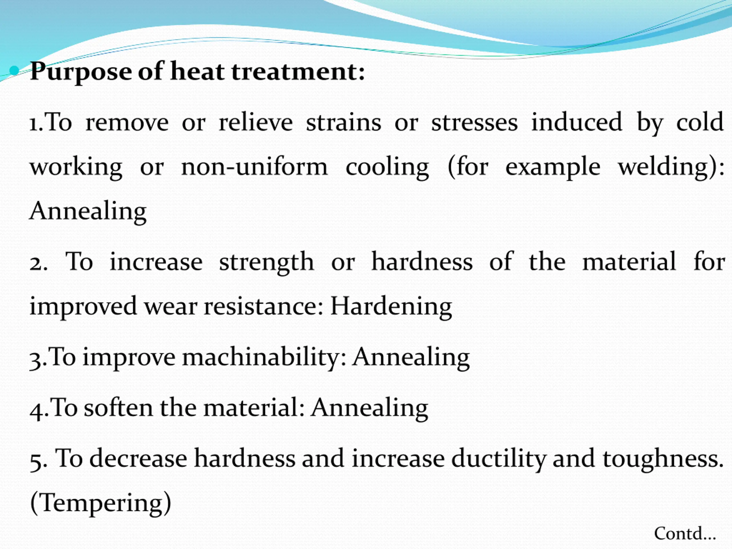 Purpose of heat treatment: 1.To remove or relieve strains or stresses induced by cold working or non-uniform cooling (for example welding): Annealing 2. To increase strength or hardness of the material for improved wear resistance: Hardening 3.To improve machinability: Annealing 4.To soften the material: Annealing 5. To decrease hardness and increase ductility and toughness. (Tempering) Contd...