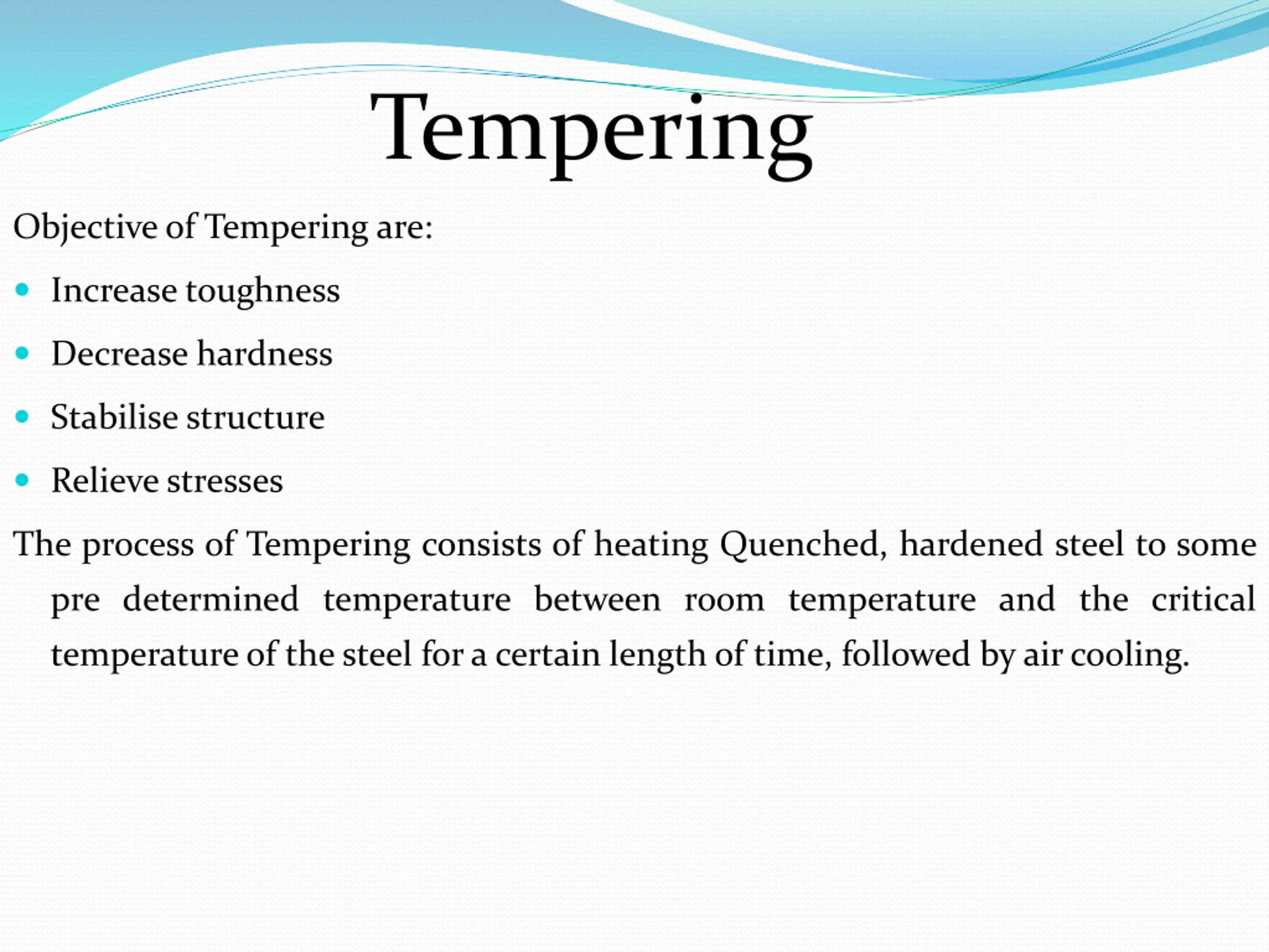Tempering Objective of Tempering are: Increase toughness Decrease hardness Stabilise structure Relieve stresses The process of Tempering consists of heating Quenched, hardened steel to some pre determined temperature between room temperature and the critical temperature of the steel for a certain length of time, followed by air cooling.