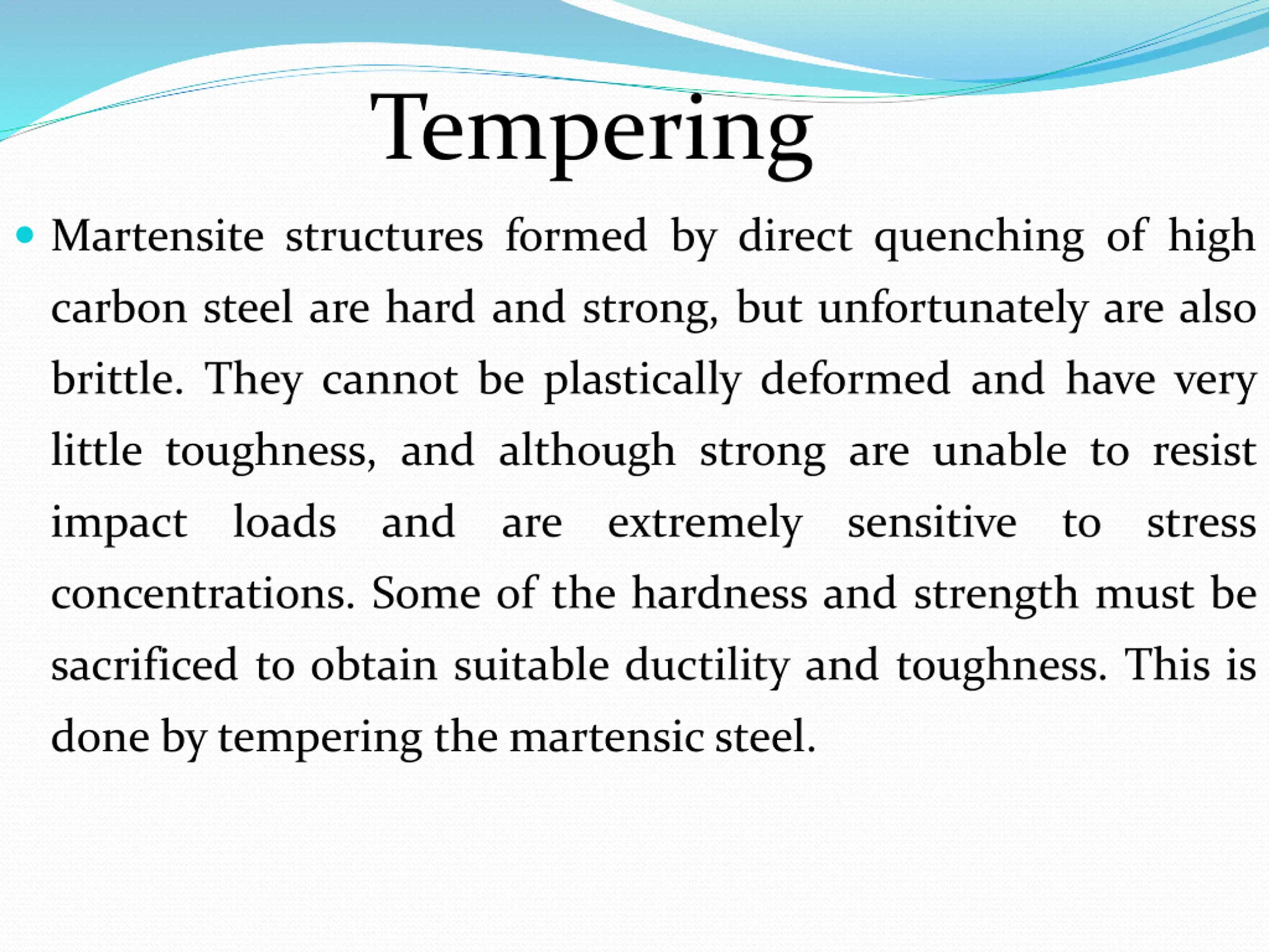 Tempering Martensite structures formed by direct quenching of high carbon steel are hard and strong, but unfortunately are also brittle. They cannot be plastically deformed and have very little toughness, and although strong are unable to resist impact loads and are extremely sensitive to stress concentrations. Some of the hardness and strength must be sacrificed to obtain suitable ductility and toughness. This is done by tempering the martensic steel.