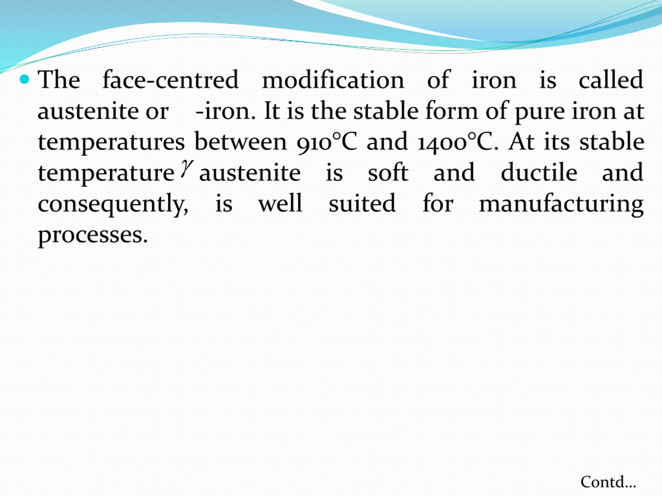 The face-centred modification of iron is called austenite or -iron. It is the stable form of pure iron at temperatures between 910 C and 1400 C. At its stable temperature austenite is soft and ductile and consequently, is well suited for manufacturing processes. Contd