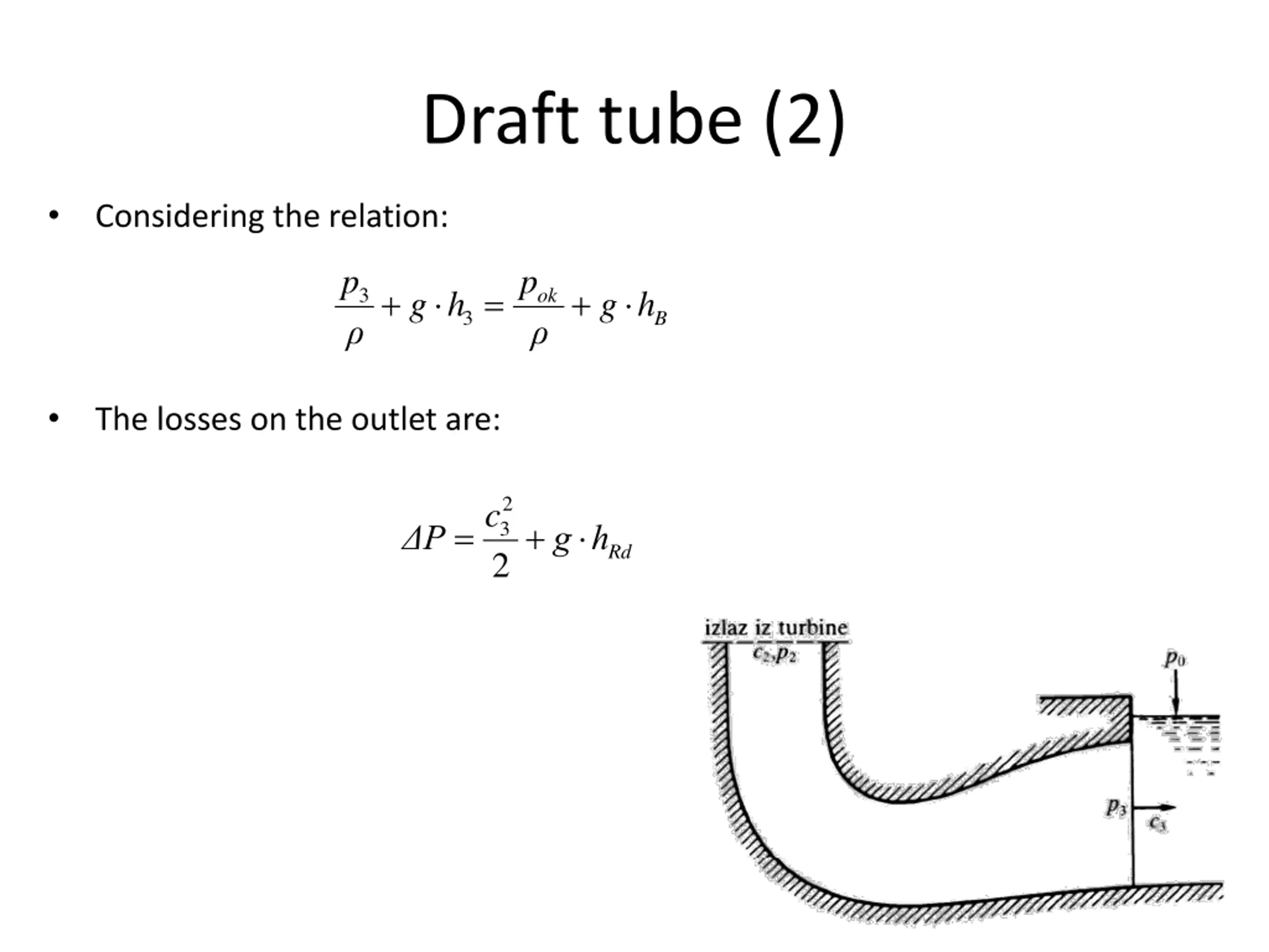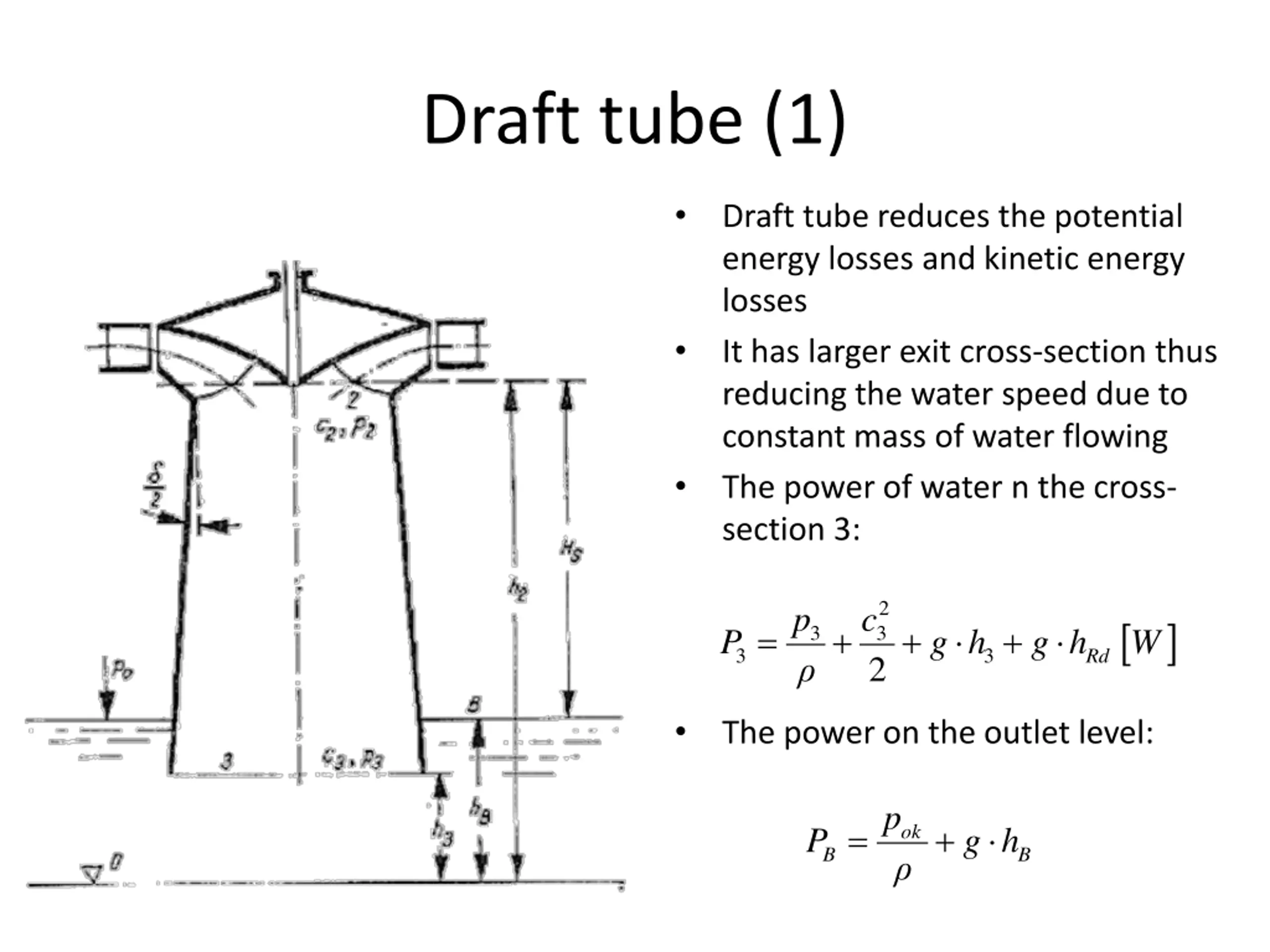 Draft tube (1) Draft tube reduces the potential energy losses and kinetic energy losses It has larger exit cross-section thus reducing the water speed due to constant mass of water flowing The power of water n the cross- section 3: 2 3 p c W = + + g h + g h 3 P 3 3 Rd 2 The power on the outlet level: p = + g h ok P B B