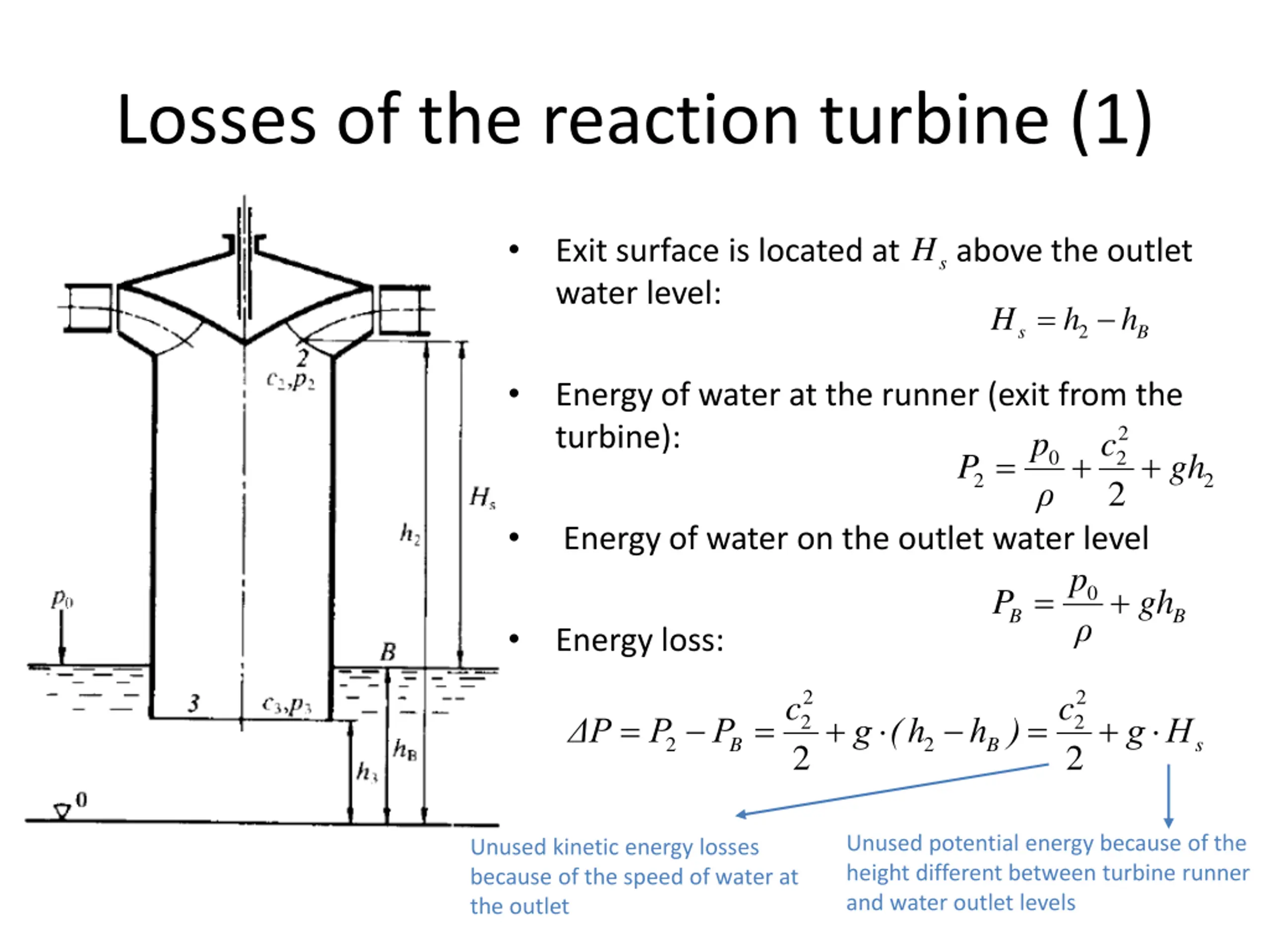 Losses of the reaction turbine (1) H Exit surface is located at above the outlet water level: s = H h h 2 s B Energy of water at the runner (exit from the turbine): 2 2 p c = + + 0 P gh 2 2 2 Energy of water on the outlet water level p = + 0 P gh B B Energy loss: 2 2 2 2 c c = = + = + P P P g (h h ) g H 2 2 B B s 2 2 Unused potential energy because of the height different between turbine runner and water outlet levels Unused kinetic energy losses because of the speed of water at the outlet