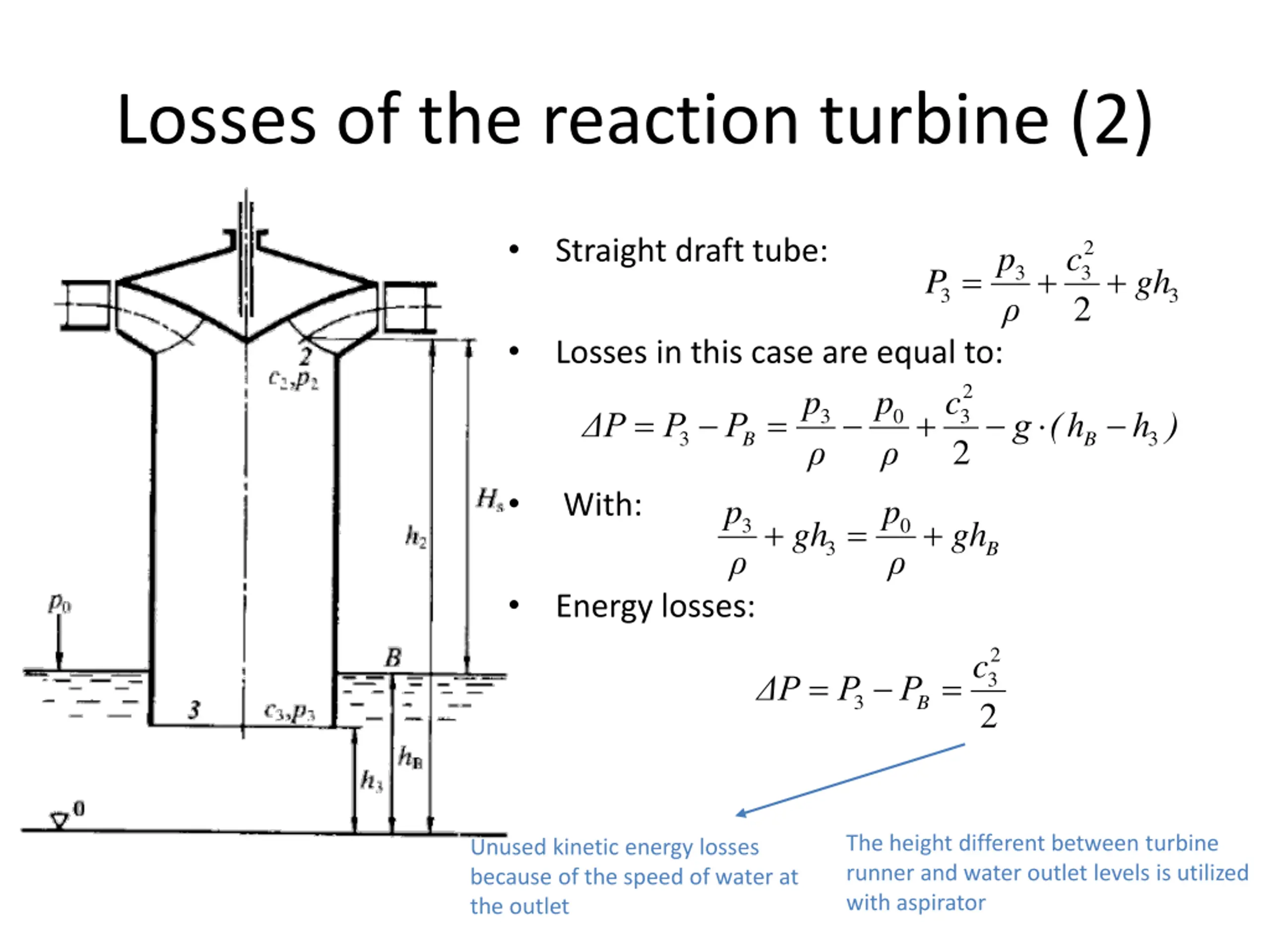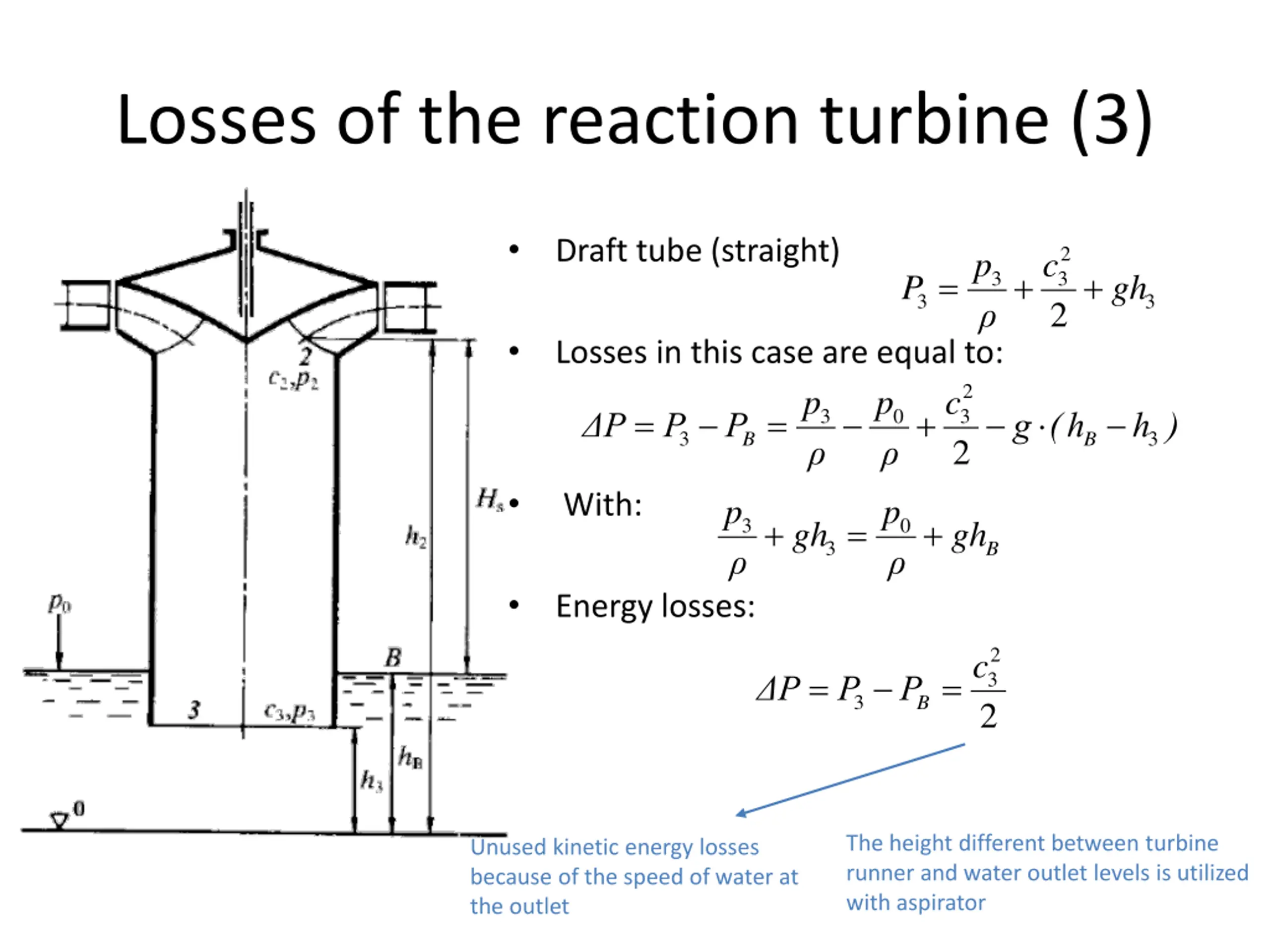 Losses of the reaction turbine (2) Straight draft tube: 2 3 p c = + + 3 P gh 3 3 2 Losses in this case are equal to: 2 3 p p c = = + 3 0 P P P g (h h ) 3 3 B B 2 With: p p + = + 3 0 gh gh 3 B Energy losses: 2 3 c = = P P P 3 B 2 The height different between turbine runner and water outlet levels is utilized with aspirator Unused kinetic energy losses because of the speed of water at the outlet