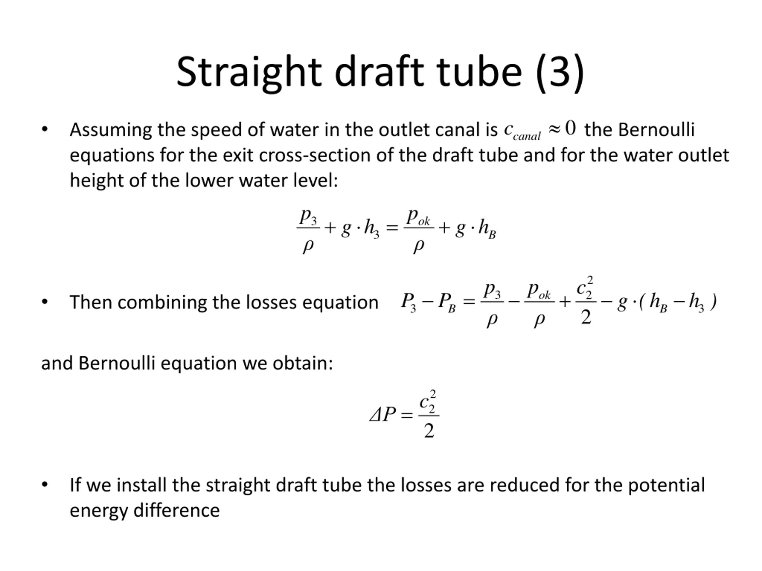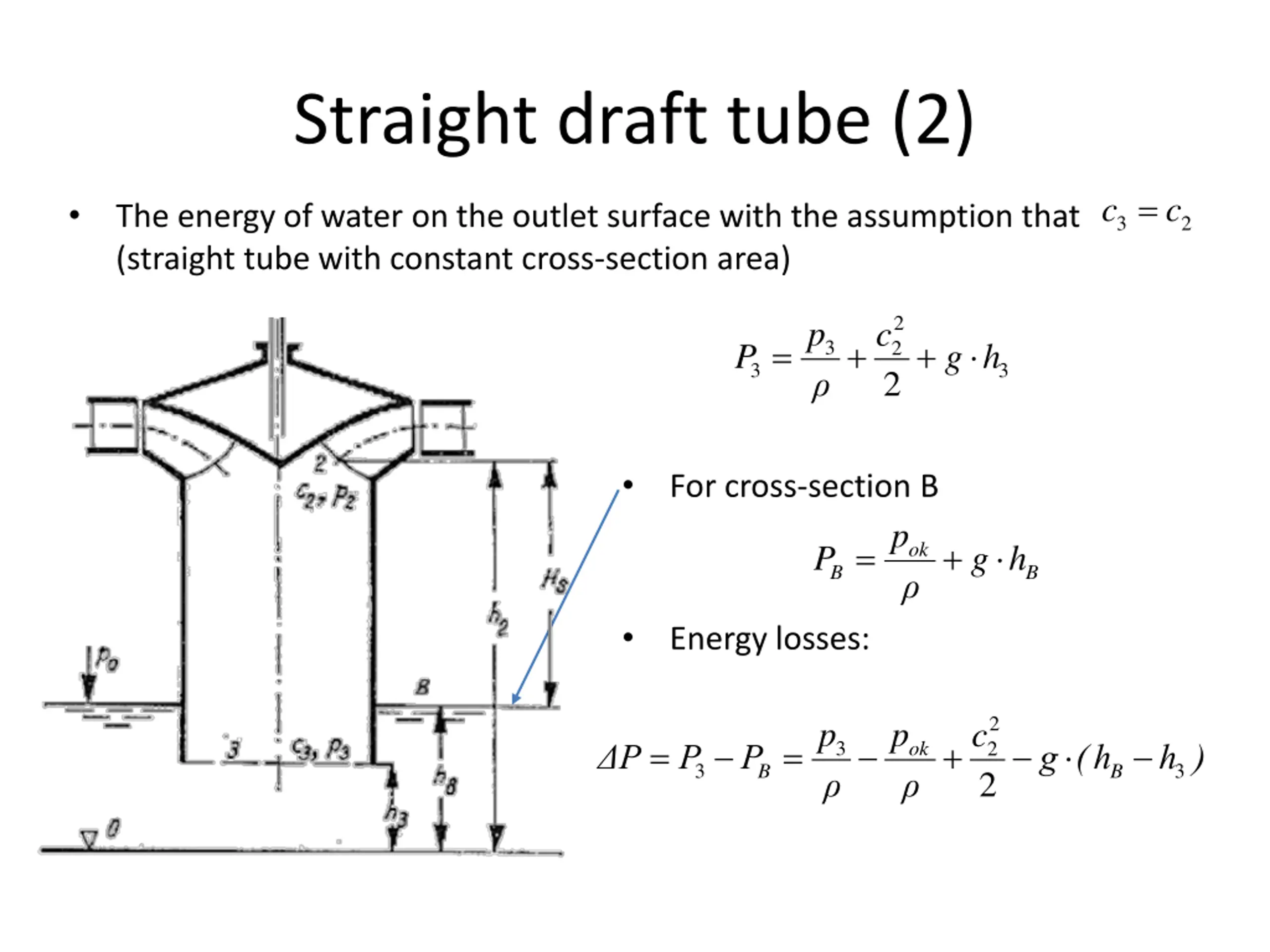 Straight draft tube (2) = c c The energy of water on the outlet surface with the assumption that (straight tube with constant cross-section area) 3 2 2 2 p c = + + g h 3 P 3 3 2 For cross-section B p = + g h ok P B B Energy losses: 2 2 p p c = = + g (h 3 ok P P P h ) 3 3 B B 2