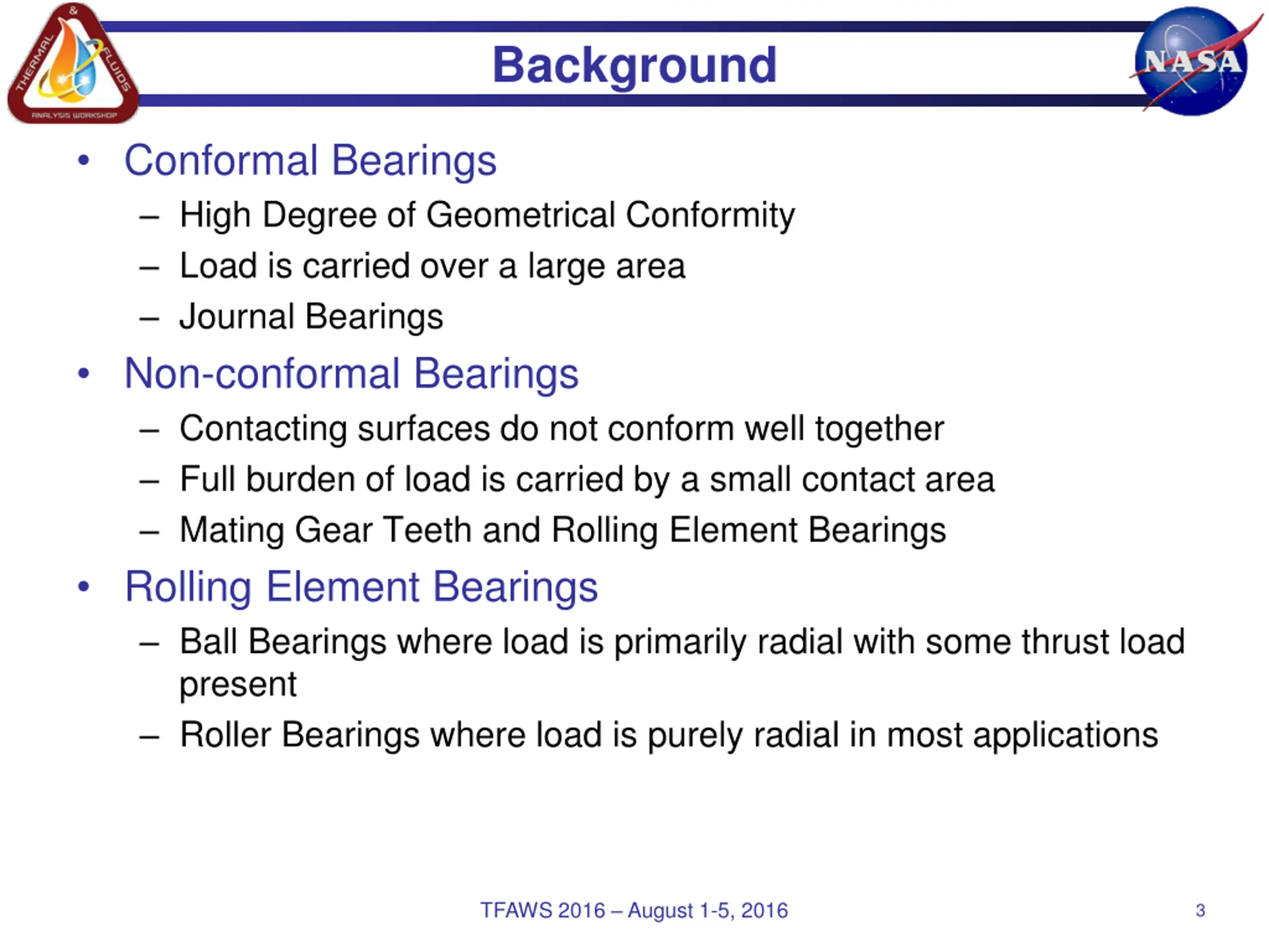 Background Conformal Bearings High Degree of Geometrical Conformity Load is carried over a large area Journal Bearings Non-conformal Bearings Contacting surfaces do not conform well together Full burden of load is carried by a small contact area Mating Gear Teeth and Rolling Element Bearings Rolling Element Bearings Ball Bearings where load is primarily radial with some thrust load present Roller Bearings where load is purely radial in most applications TFAWS 2016 August 1-5, 2016 3