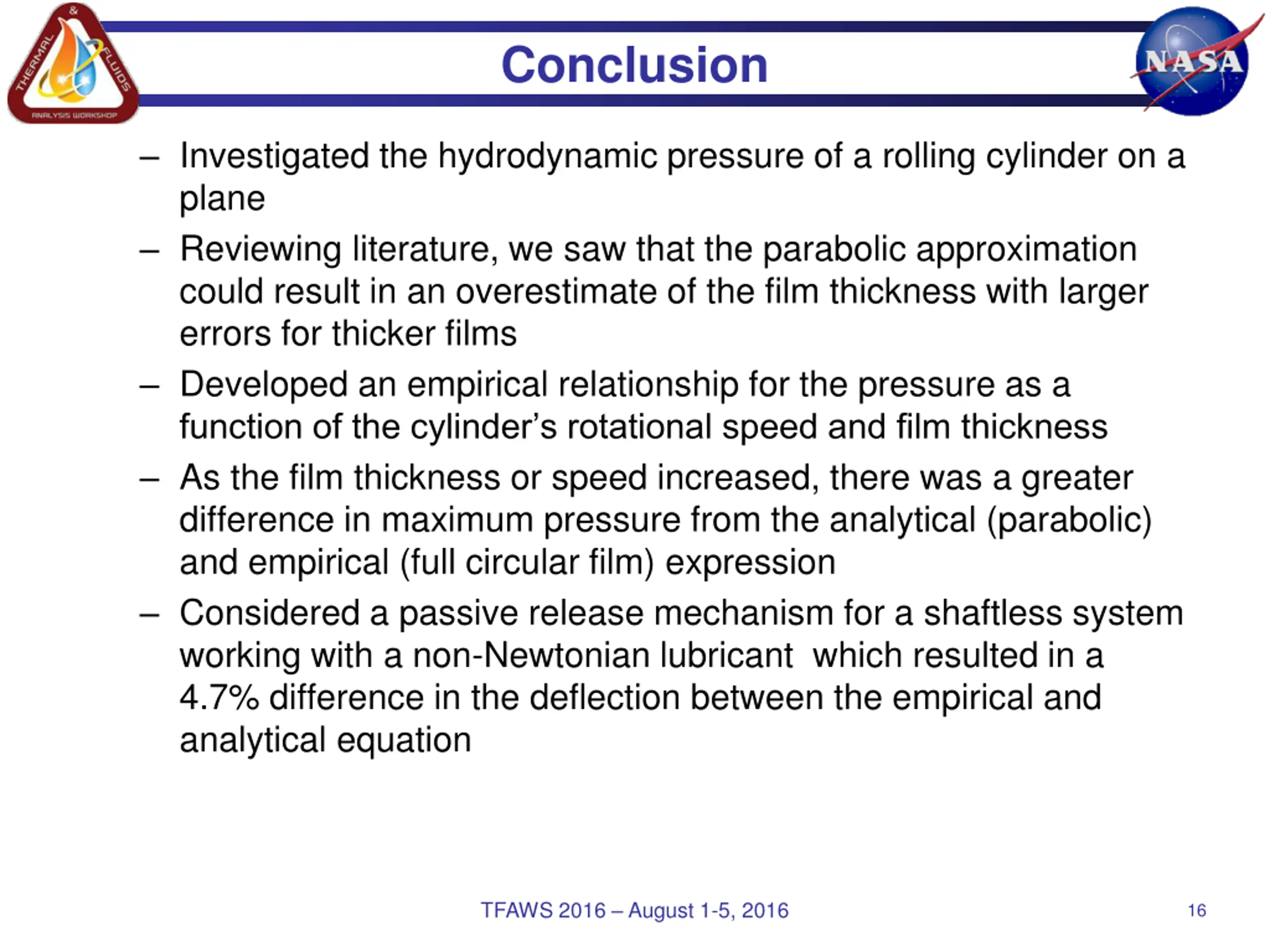 Conclusion Investigated the hydrodynamic pressure of a rolling cylinder on a plane Reviewing literature, we saw that the parabolic approximation could result in an overestimate of the film thickness with larger errors for thicker films Developed an empirical relationship for the pressure as a function of the cylinder s rotational speed and film thickness As the film thickness or speed increased, there was a greater difference in maximum pressure from the analytical (parabolic) and empirical (full circular film) expression Considered a passive release mechanism for a shaftless system working with a non-Newtonian lubricant which resulted in a 4.7% difference in the deflection between the empirical and analytical equation TFAWS 2016 August 1-5, 2016 16