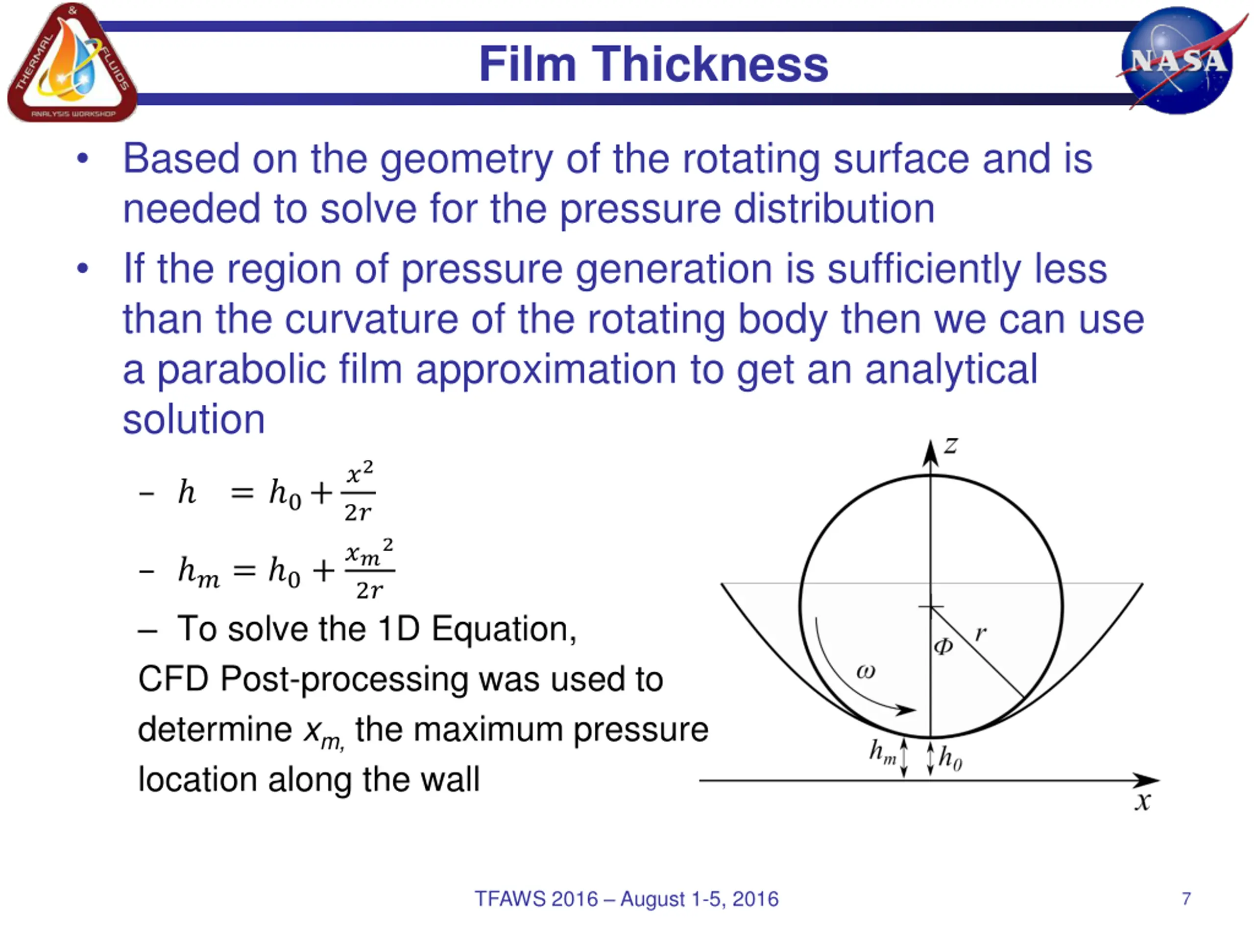 Film Thickness Based on the geometry of the rotating surface and is needed to solve for the pressure distribution If the region of pressure generation is sufficiently less than the curvature of the rotating body then we can use a parabolic film approximation to get an analytical solution = 0+ ?2 2? ?= 0+??2 2? To solve the 1D Equation, CFD Post-processing was used to determine xm,the maximum pressure location along the wall TFAWS 2016 August 1-5, 2016 7