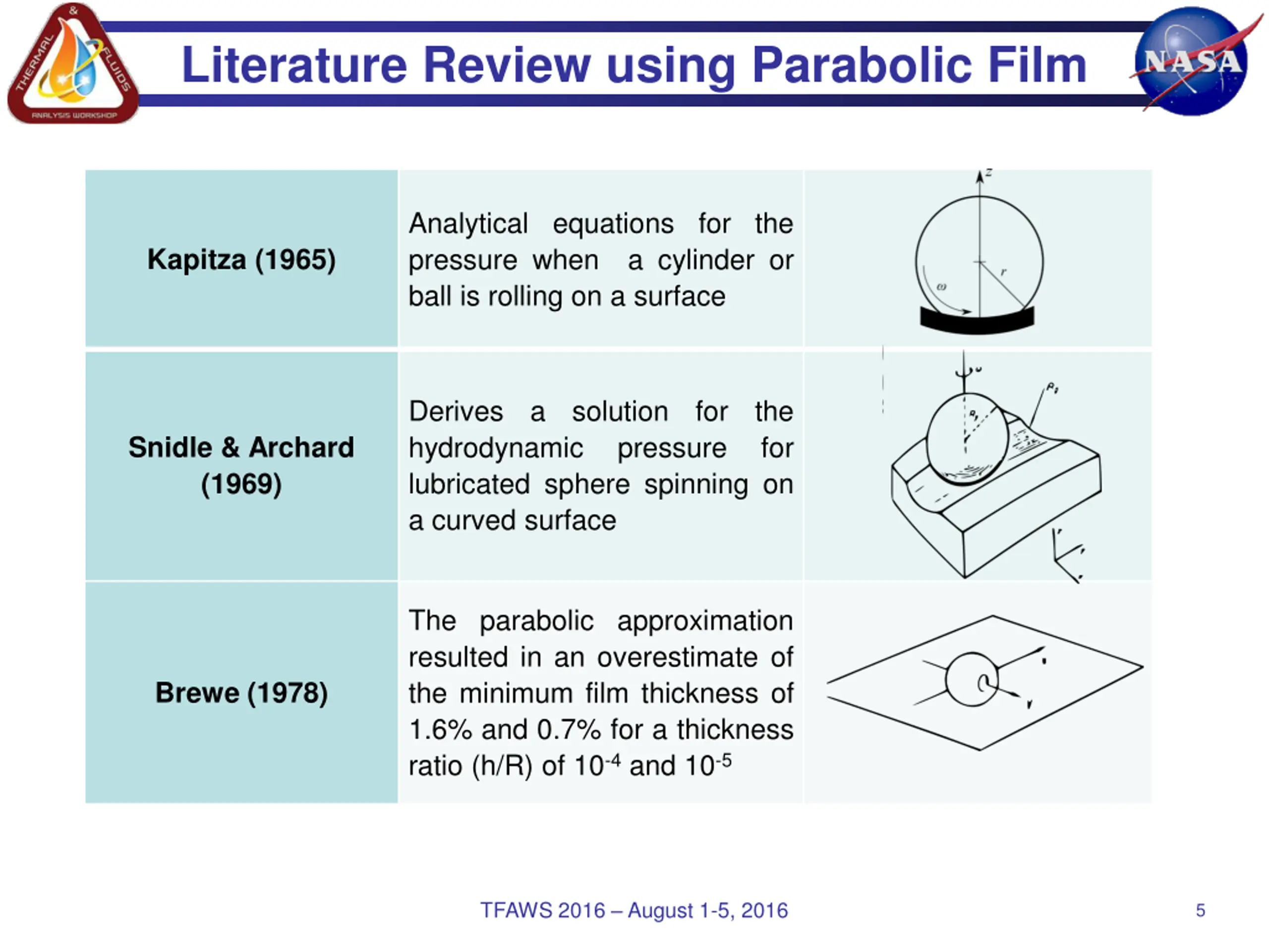 Literature Review using Parabolic Film Analytical equations for the pressure when a cylinder or ball is rolling on a surface Kapitza (1965) Derives a solution for the hydrodynamic lubricated sphere spinning on a curved surface Snidle & Archard (1969) pressure for The parabolic approximation resulted in an overestimate of the minimum film thickness of 1.6% and 0.7% for a thickness ratio (h/R) of 10-4 and 10-5 Brewe (1978) TFAWS 2016 August 1-5, 2016 5