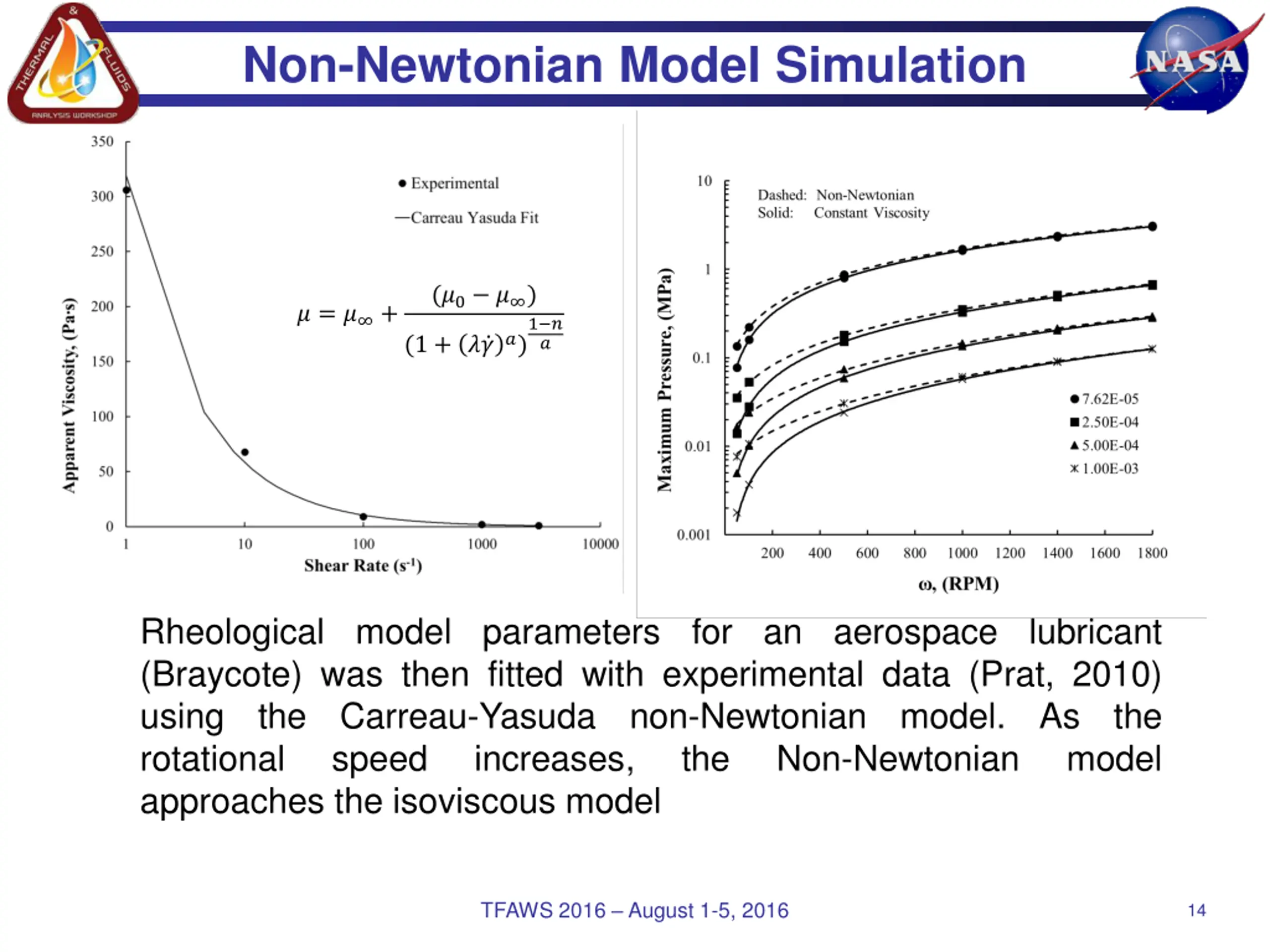 Non-Newtonian Model Simulation (?0 ? ) ? = ? + 1 ? ? (1 + ? ??) Rheological model parameters for an aerospace lubricant (Braycote) was then fitted with experimental data (Prat, 2010) using the Carreau-Yasuda non-Newtonian model. As the rotational speed increases, approaches the isoviscous model the Non-Newtonian model TFAWS 2016 August 1-5, 2016 14