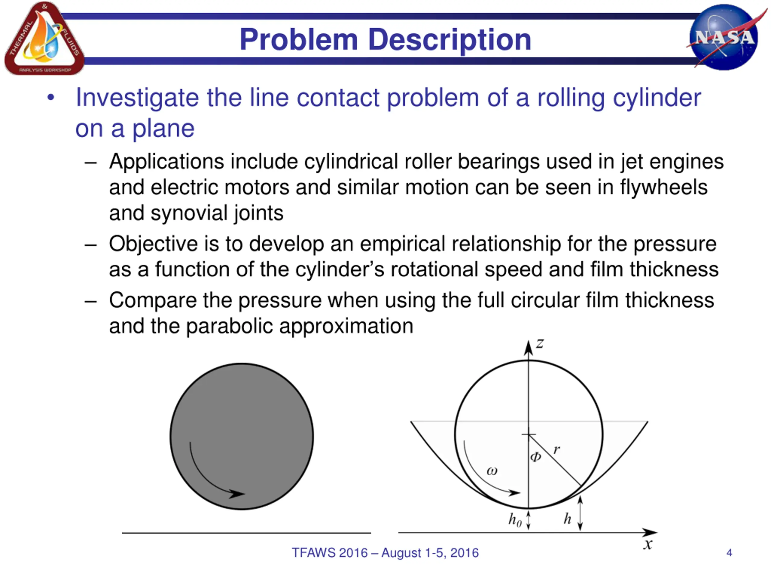 Problem Description Investigate the line contact problem of a rolling cylinder on a plane Applications include cylindrical roller bearings used in jet engines and electric motors and similar motion can be seen in flywheels and synovial joints Objective is to develop an empirical relationship for the pressure as a function of the cylinder s rotational speed and film thickness Compare the pressure when using the full circular film thickness and the parabolic approximation TFAWS 2016 August 1-5, 2016 4