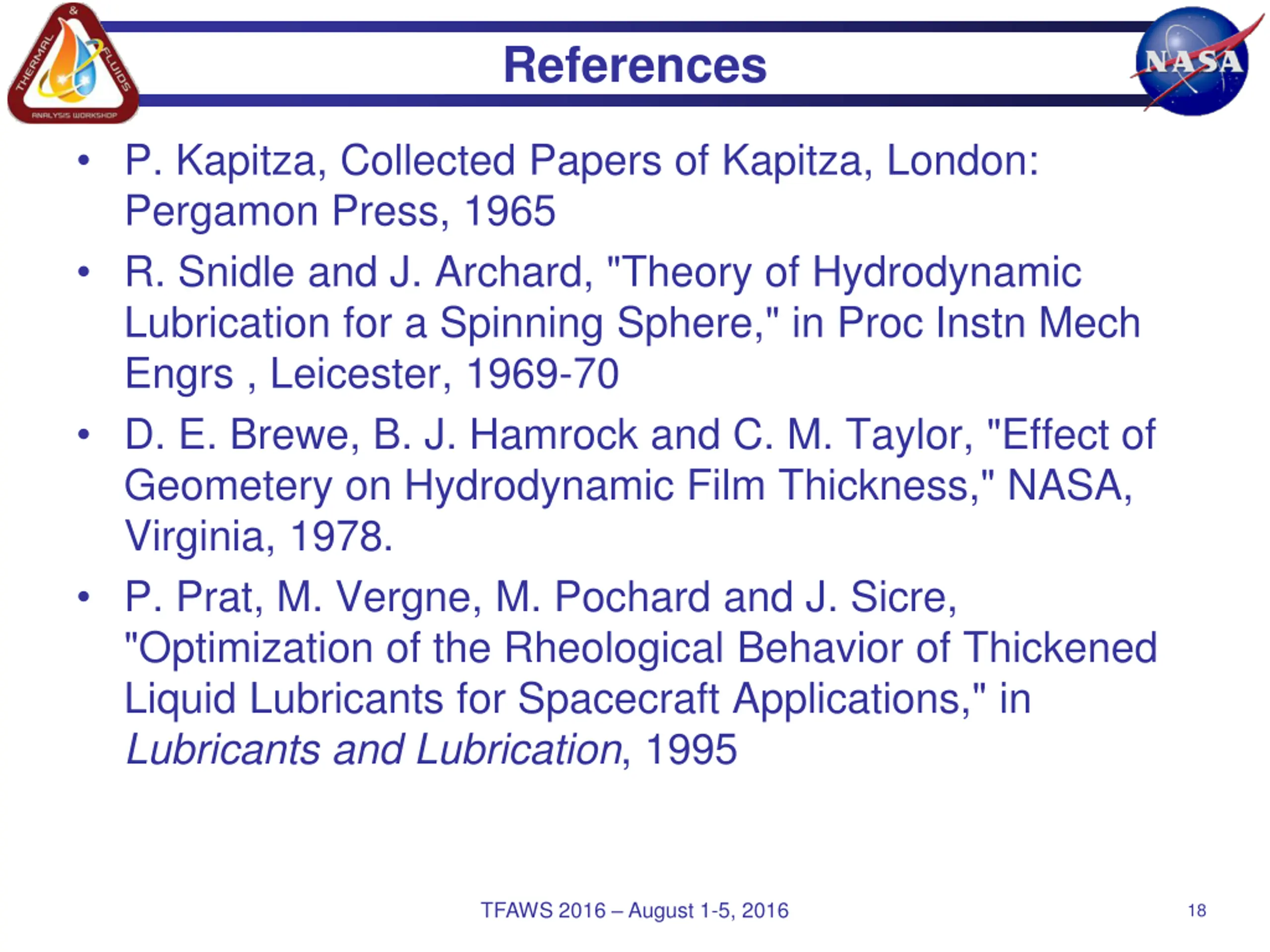 References P. Kapitza, Collected Papers of Kapitza, London: Pergamon Press, 1965 R. Snidle and J. Archard, "Theory of Hydrodynamic Lubrication for a Spinning Sphere," in Proc Instn Mech Engrs , Leicester, 1969-70 D. E. Brewe, B. J. Hamrock and C. M. Taylor, "Effect of Geometery on Hydrodynamic Film Thickness," NASA, Virginia, 1978. P. Prat, M. Vergne, M. Pochard and J. Sicre, "Optimization of the Rheological Behavior of Thickened Liquid Lubricants for Spacecraft Applications," in Lubricants and Lubrication, 1995 TFAWS 2016 August 1-5, 2016 18