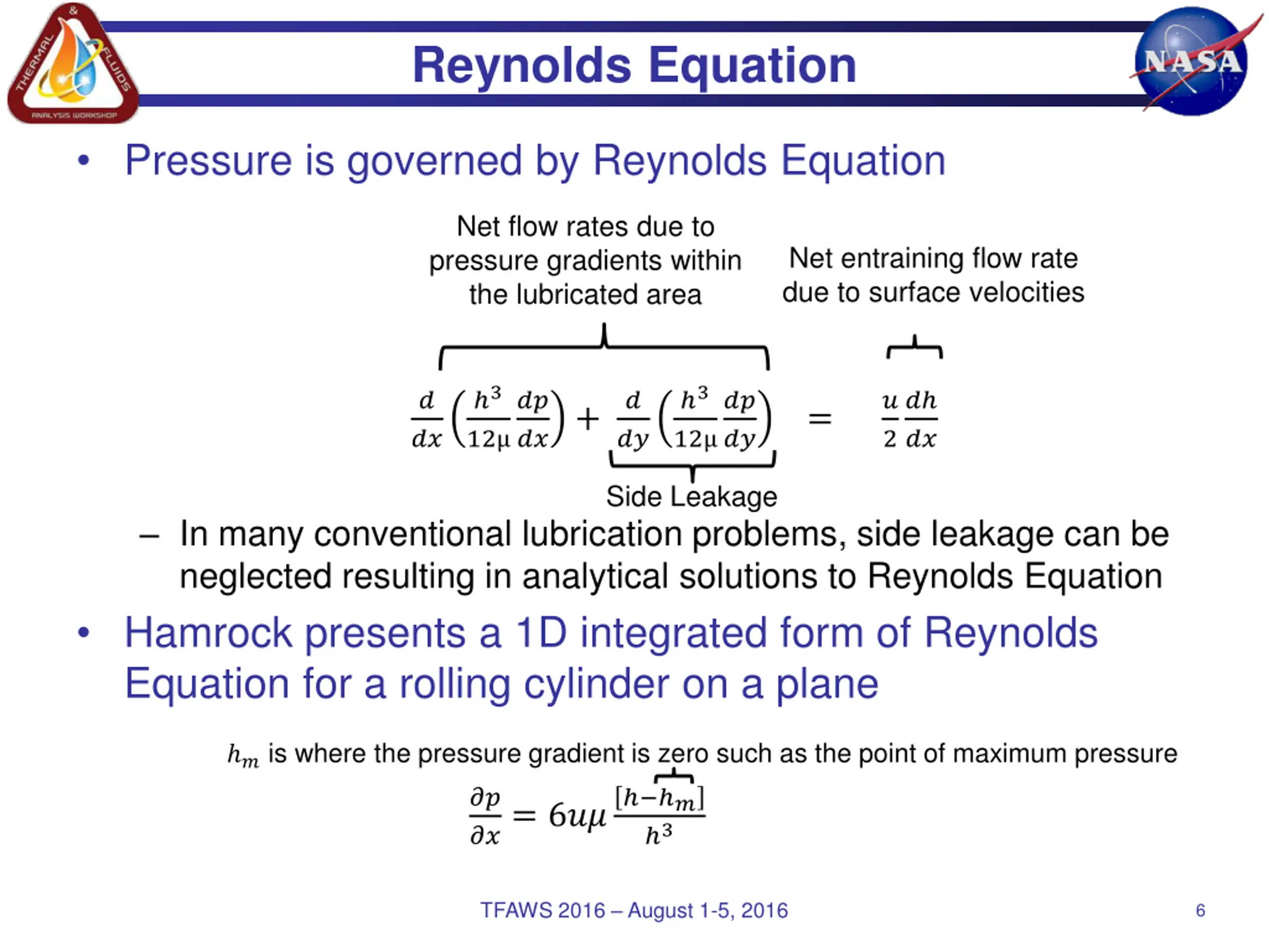 Reynolds Equation Pressure is governed by Reynolds Equation Net flow rates due to pressure gradients within the lubricated area Net entraining flow rate due to surface velocities 3 12 3 12 ? ?? ?? ??+ ? ?? ?? ?? = ? 2 ? ?? Side Leakage In many conventional lubrication problems, side leakage can be neglected resulting in analytical solutions to Reynolds Equation Hamrock presents a 1D integrated form of Reynolds Equation for a rolling cylinder on a plane ? is where the pressure gradient is zero such as the point of maximum pressure ?? ??= 6?? ? 3 TFAWS 2016 August 1-5, 2016 6