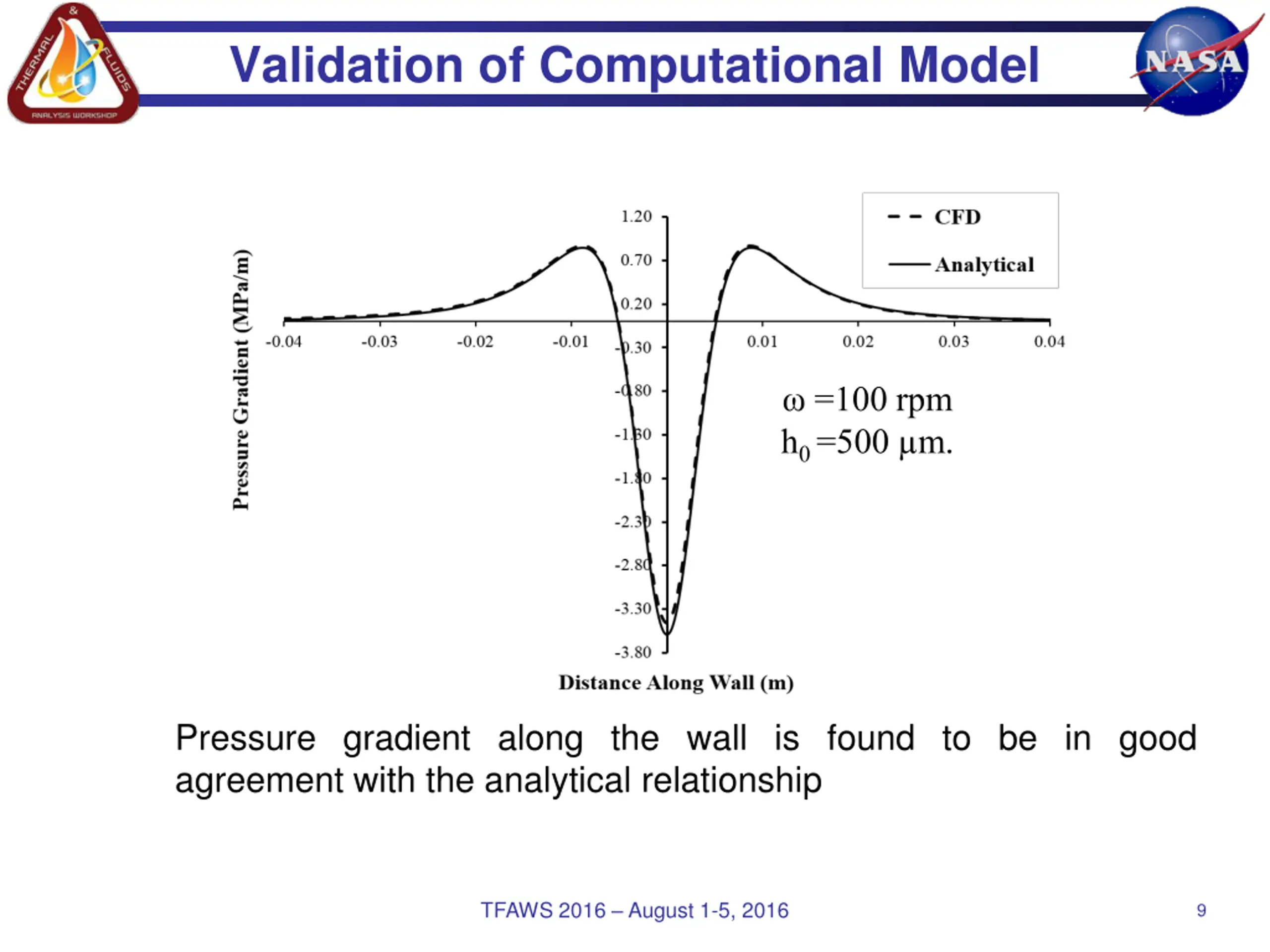 Validation of Computational Model =100 rpm h0 =500 m. Pressure gradient along the wall is found to be in good agreement with the analytical relationship TFAWS 2016 August 1-5, 2016 9