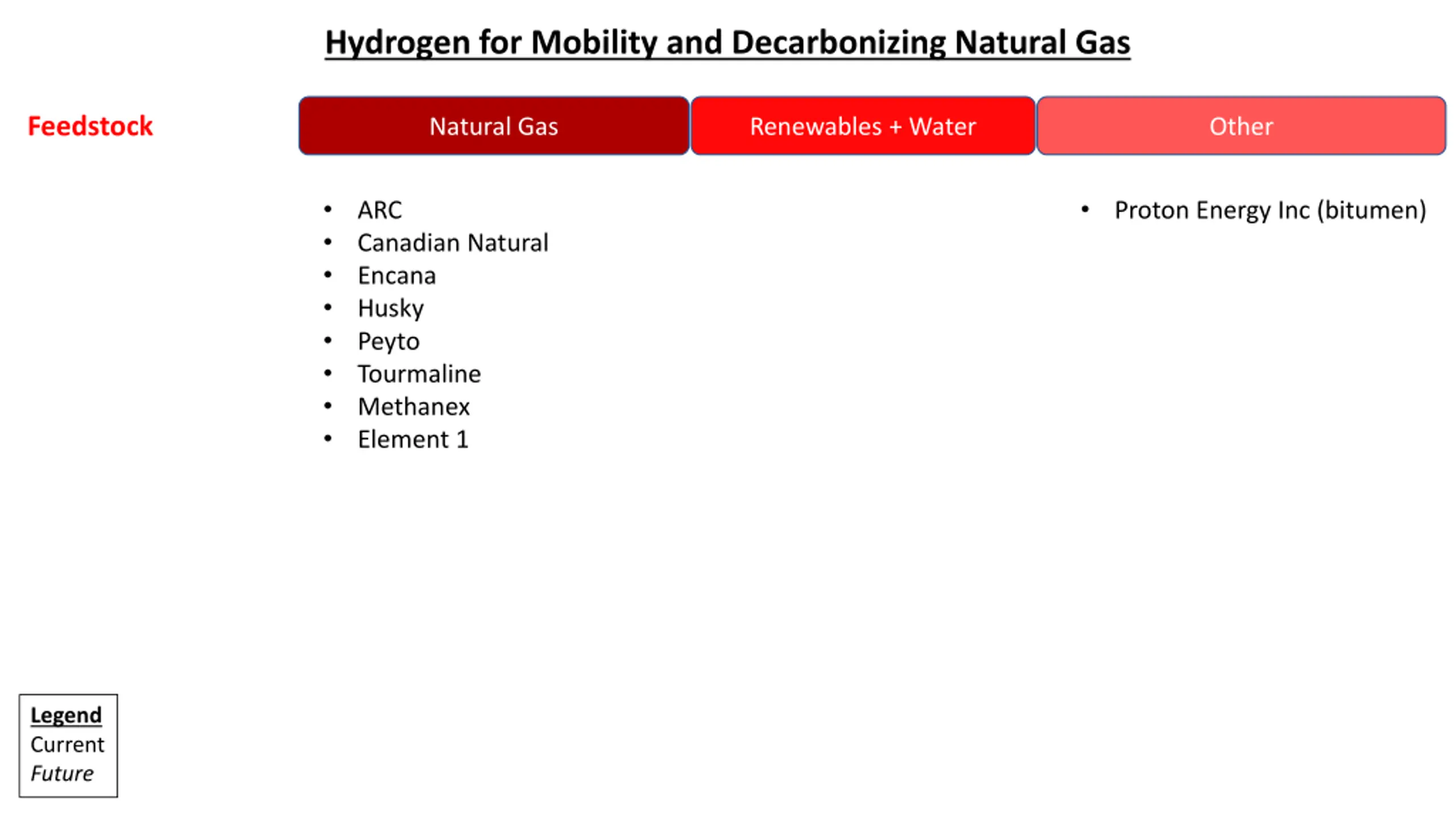 Hydrogen for Mobility and Decarbonizing Natural Gas Feedstock Natural Gas Renewables + Water Other ARC Canadian Natural Encana Husky Peyto Tourmaline Methanex Element 1 Proton Energy Inc (bitumen) Legend Current Future