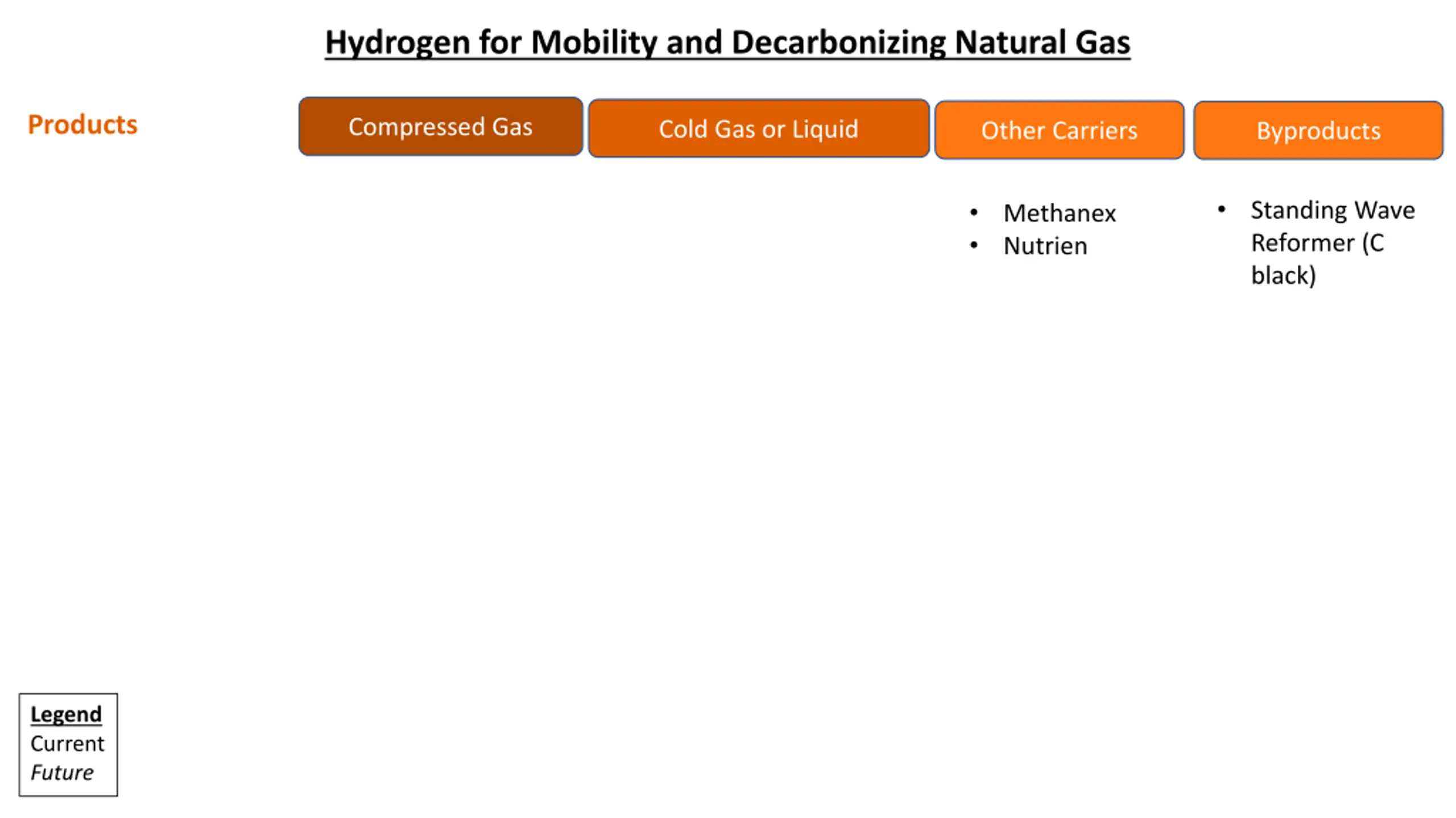 Hydrogen for Mobility and Decarbonizing Natural Gas Products Compressed Gas Cold Gas or Liquid Other Carriers Byproducts Standing Wave Reformer (C black) Methanex Nutrien Legend Current Future