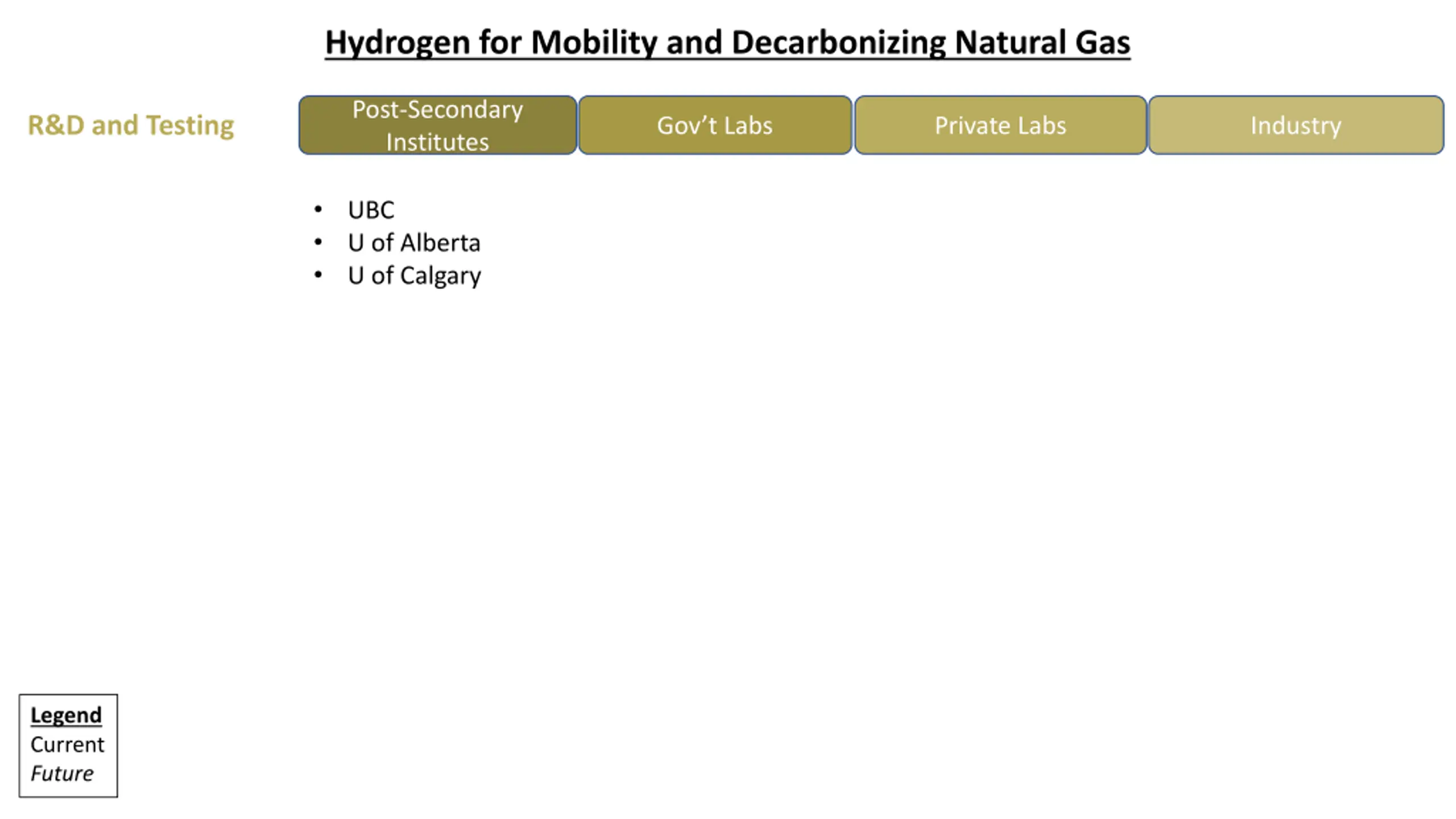 Hydrogen for Mobility and Decarbonizing Natural Gas Post-Secondary Institutes R&D and Testing Gov t Labs Private Labs Industry UBC U of Alberta U of Calgary Legend Current Future