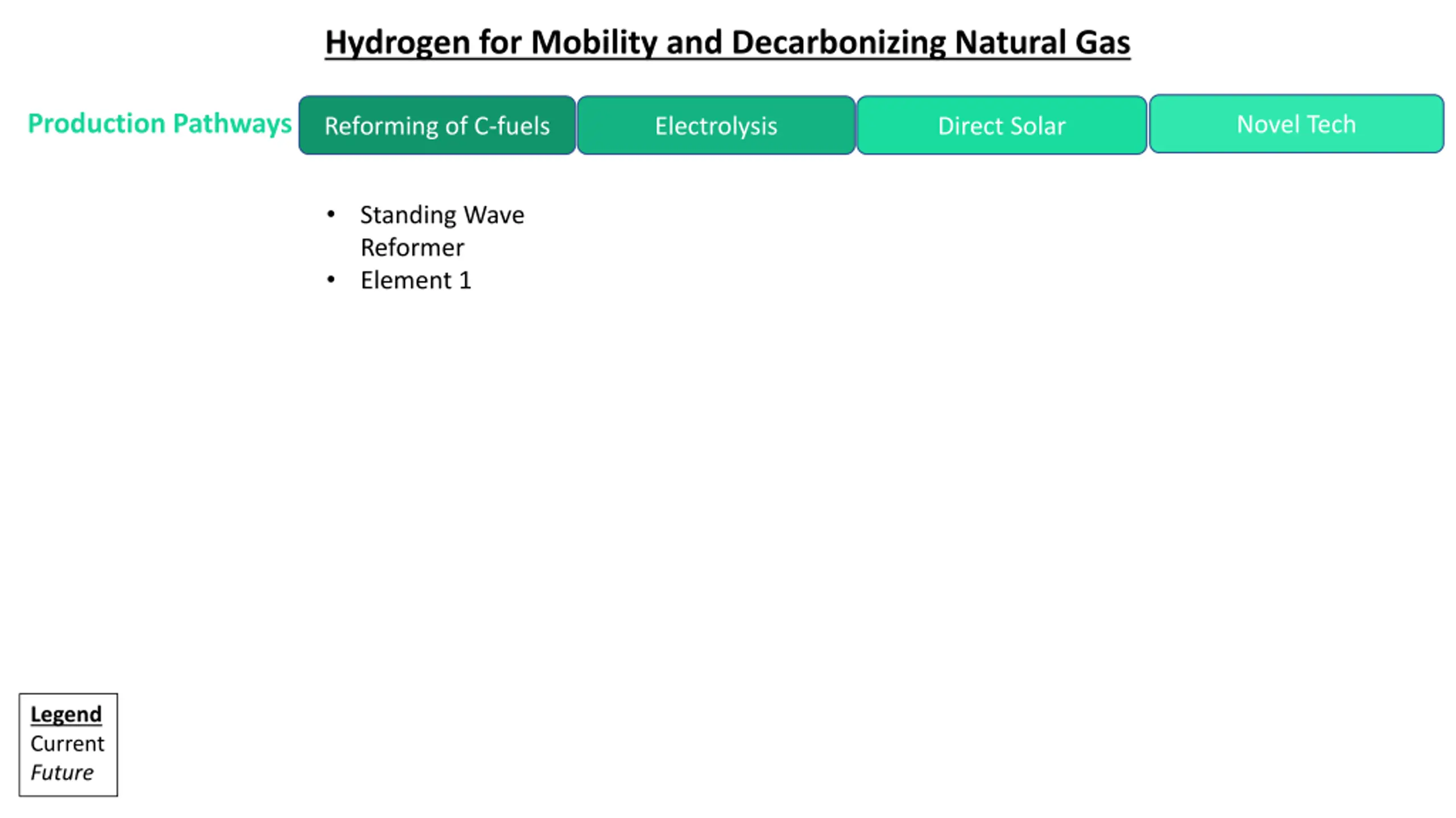 Hydrogen for Mobility and Decarbonizing Natural Gas Production Pathways Novel Tech Reforming of C-fuels Electrolysis Direct Solar Standing Wave Reformer Element 1 Legend Current Future