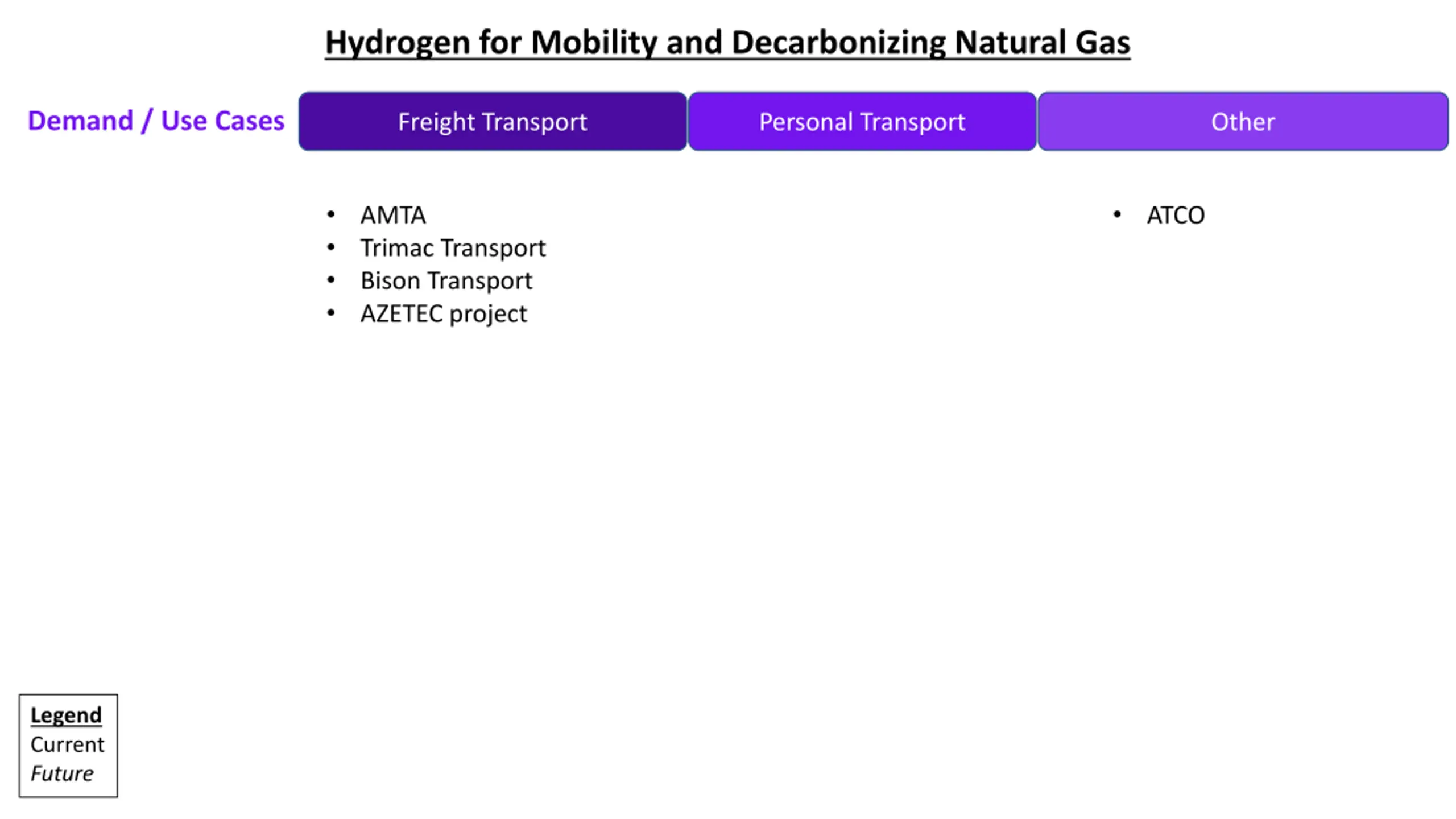 Hydrogen for Mobility and Decarbonizing Natural Gas Demand / Use Cases Freight Transport Personal Transport Other AMTA Trimac Transport Bison Transport AZETEC project ATCO Legend Current Future