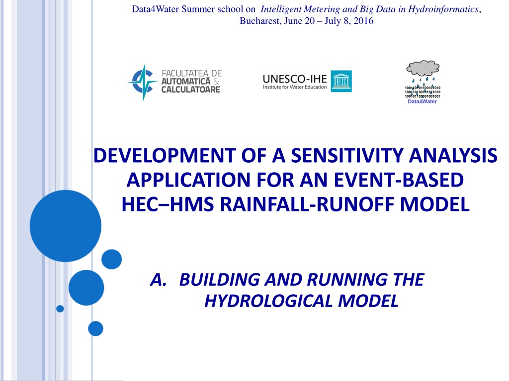 Data4Water Summer school on Intelligent Metering and Big Data in Hydroinformatics, Bucharest, June 20 July 8, 2016 DEVELOPMENT OF A SENSITIVITY ANALYSIS APPLICATION FOR AN EVENT-BASED HEC HMS RAINFALL-RUNOFF MODEL A. BUILDING AND RUNNING THE HYDROLOGICAL MODEL