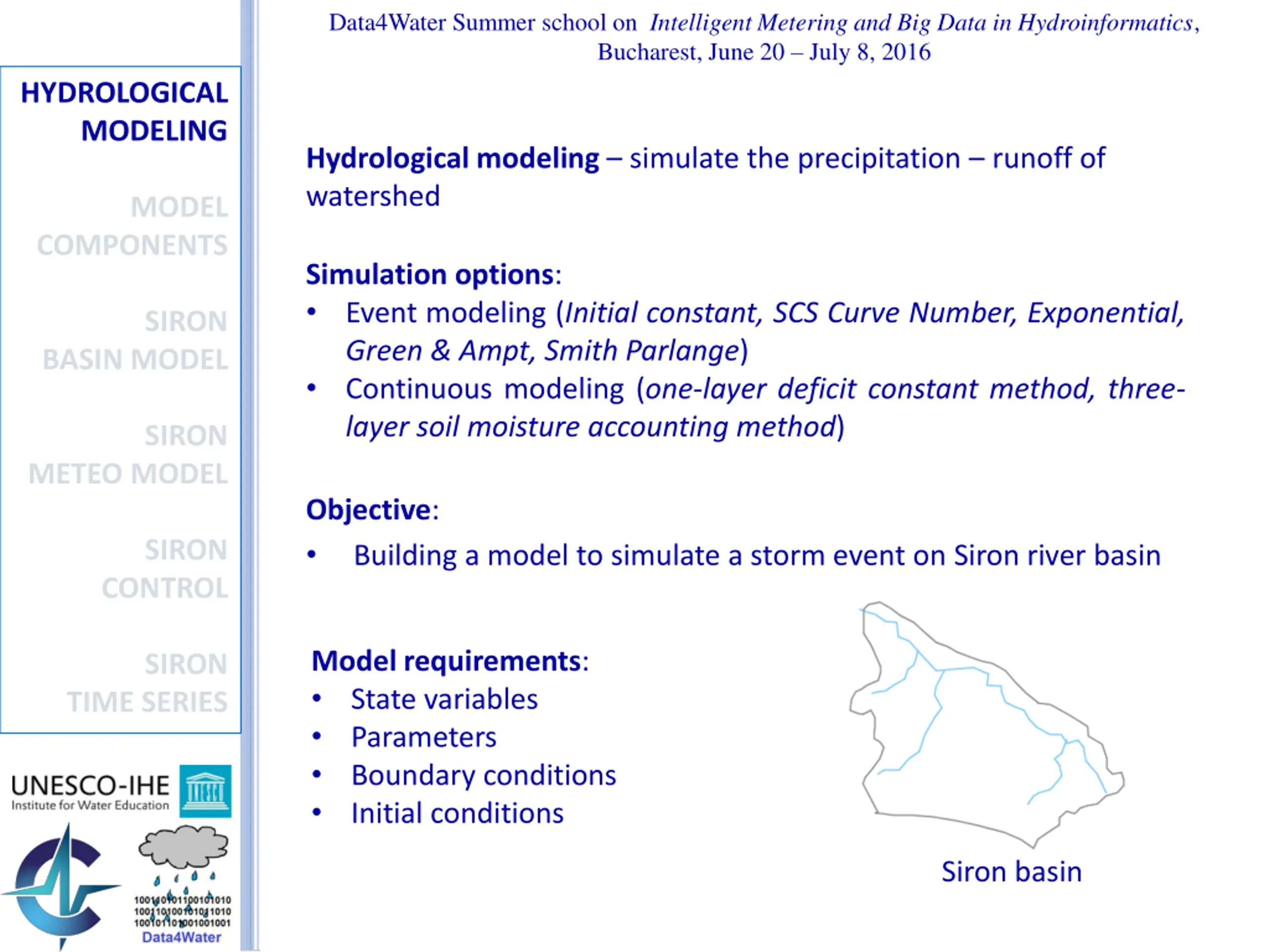 Data4Water Summer school on Intelligent Metering and Big Data in Hydroinformatics, Bucharest, June 20 July 8, 2016 HYDROLOGICAL MODELING Hydrological modeling simulate the precipitation runoff of watershed MODEL COMPONENTS Simulation options: Event modeling (Initial constant, SCS Curve Number, Exponential, Green & Ampt, Smith Parlange) Continuous modeling (one-layer deficit constant method, three- layer soil moisture accounting method) SIRON BASIN MODEL SIRON METEO MODEL Objective: Building a model to simulate a storm event on Siron river basin SIRON CONTROL Model requirements: State variables Parameters Boundary conditions Initial conditions SIRON TIME SERIES Siron basin