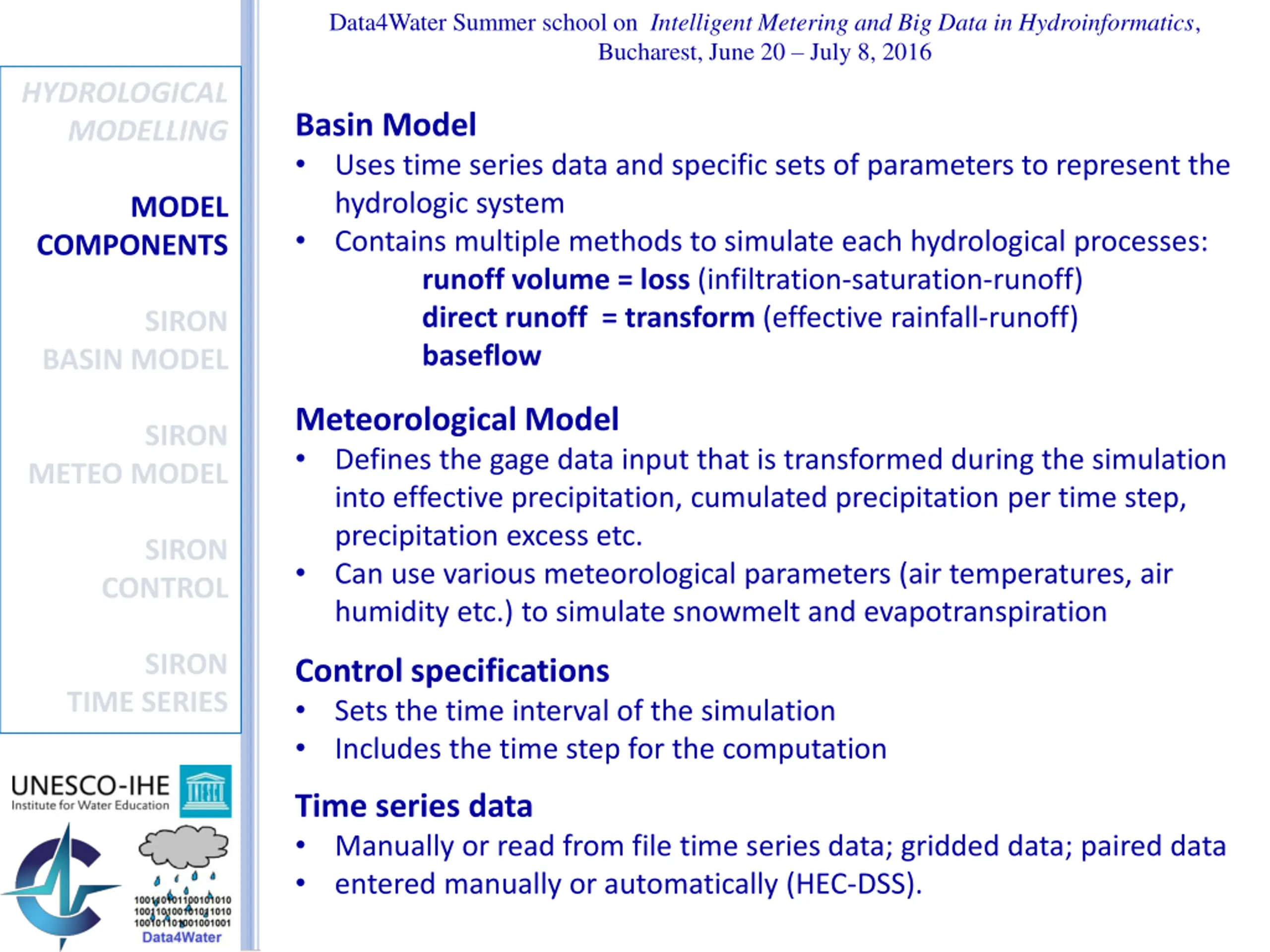 Data4Water Summer school on Intelligent Metering and Big Data in Hydroinformatics, Bucharest, June 20 July 8, 2016 HYDROLOGICAL MODELLING Basin Model Uses time series data and specific sets of parameters to represent the hydrologic system Contains multiple methods to simulate each hydrological processes: runoff volume = loss (infiltration-saturation-runoff) direct runoff = transform (effective rainfall-runoff) baseflow MODEL COMPONENTS SIRON BASIN MODEL Meteorological Model Defines the gage data input that is transformed during the simulation into effective precipitation, cumulated precipitation per time step, precipitation excess etc. Can use various meteorological parameters (air temperatures, air humidity etc.) to simulate snowmelt and evapotranspiration SIRON METEO MODEL SIRON CONTROL SIRON Control specifications Sets the time interval of the simulation Includes the time step for the computation TIME SERIES Time series data Manually or read from file time series data; gridded data; paired data entered manually or automatically (HEC-DSS).