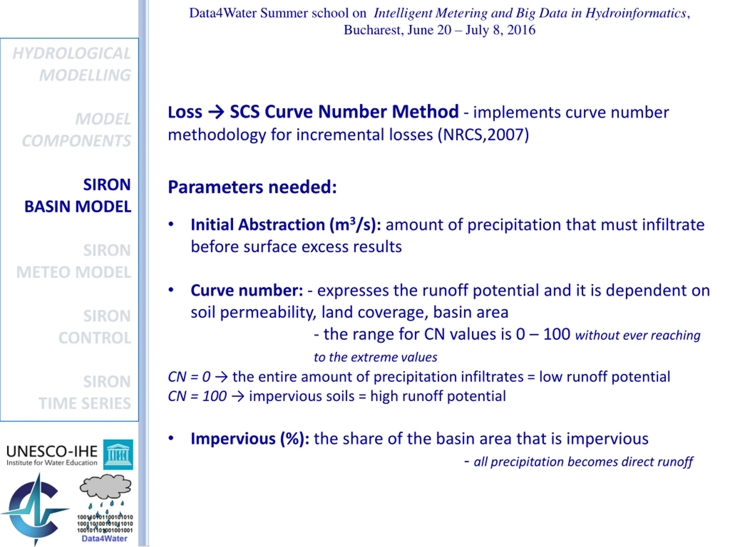 Data4Water Summer school on Intelligent Metering and Big Data in Hydroinformatics, Bucharest, June 20 July 8, 2016 HYDROLOGICAL MODELLING Loss SCS Curve Number Method - implements curve number methodology for incremental losses (NRCS,2007) MODEL COMPONENTS SIRON Parameters needed: BASIN MODEL Initial Abstraction (m3/s): amount of precipitation that must infiltrate before surface excess results SIRON METEO MODEL Curve number: - expresses the runoff potential and it is dependent on soil permeability, land coverage, basin area - the range for CN values is 0 100 without ever reaching to the extreme values CN = 0 the entire amount of precipitation infiltrates = low runoff potential CN = 100 impervious soils = high runoff potential SIRON CONTROL SIRON TIME SERIES Impervious (%): the share of the basin area that is impervious - all precipitation becomes direct runoff