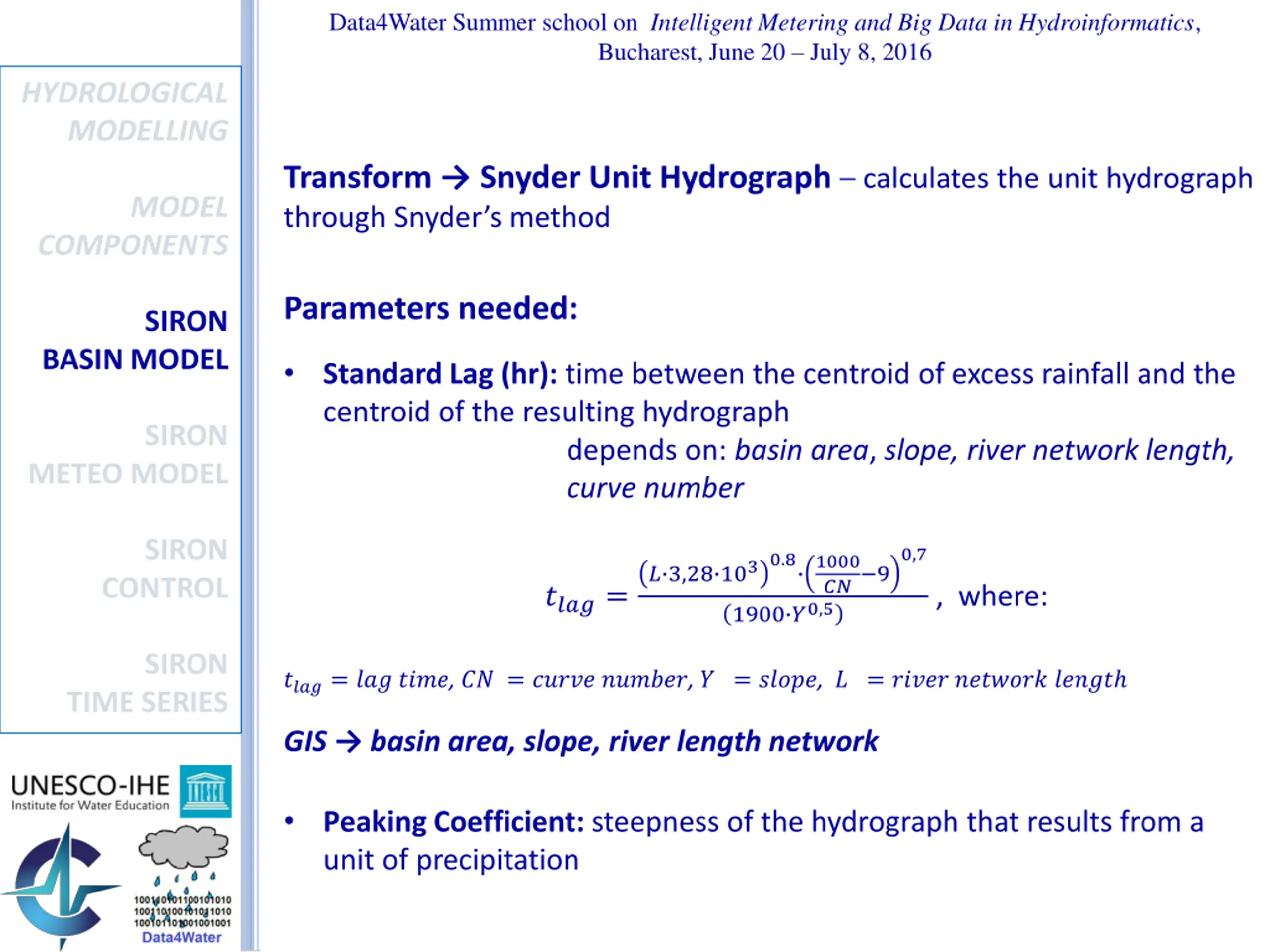 Data4Water Summer school on Intelligent Metering and Big Data in Hydroinformatics, Bucharest, June 20 July 8, 2016 HYDROLOGICAL MODELLING Transform Snyder Unit Hydrograph calculates the unit hydrograph through Snyder s method MODEL COMPONENTS Parameters needed: SIRON BASIN MODEL Standard Lag (hr): time between the centroid of excess rainfall and the centroid of the resulting hydrograph depends on: basin area, slope, river network length, curve number SIRON METEO MODEL SIRON 0,7 ? 3,28 1030.8 1000 ?? 9 CONTROL ????= , where: 1900 ?0,5 SIRON ????= ??? ????, ?? = ????? ??????, ? = ?????, ? = ????? ??????? ????? TIME SERIES GIS basin area, slope, river length network Peaking Coefficient: steepness of the hydrograph that results from a unit of precipitation