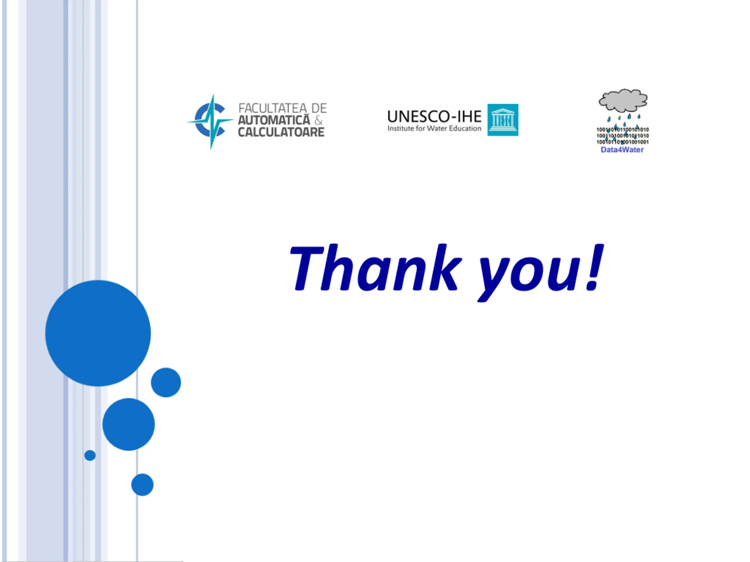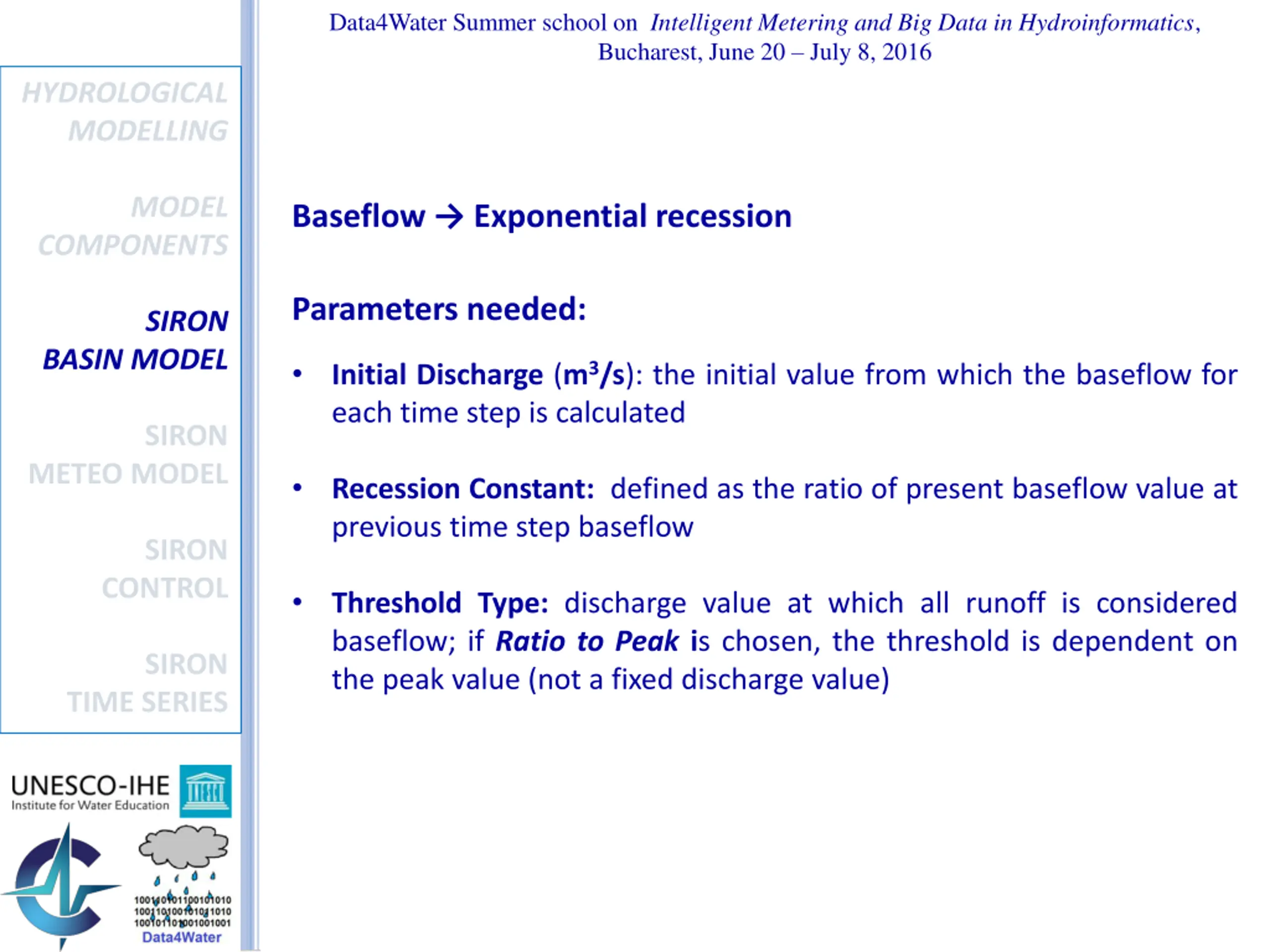 Data4Water Summer school on Intelligent Metering and Big Data in Hydroinformatics, Bucharest, June 20 July 8, 2016 HYDROLOGICAL MODELLING MODEL Baseflow Exponential recession COMPONENTS Parameters needed: SIRON BASIN MODEL Initial Discharge (m3/s): the initial value from which the baseflow for each time step is calculated SIRON METEO MODEL Recession Constant: defined as the ratio of present baseflow value at previous time step baseflow SIRON CONTROL Threshold Type: discharge value at which all runoff is considered baseflow; if Ratio to Peak is chosen, the threshold is dependent on the peak value (not a fixed discharge value) SIRON TIME SERIES