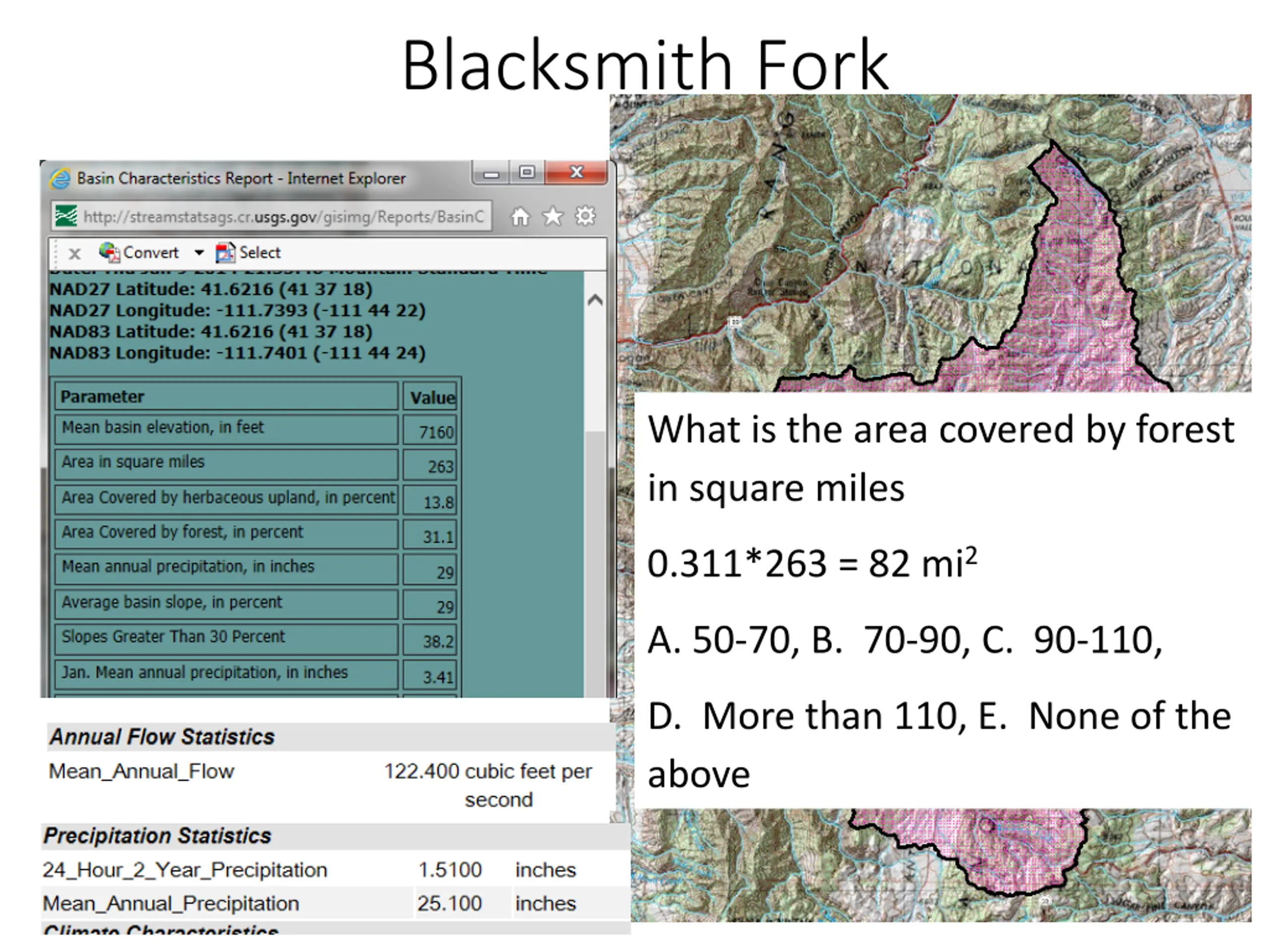 Blacksmith Fork What is the area covered by forest in square miles 0.311*263 = 82 mi2 A. 50-70, B. 70-90, C. 90-110, D. More than 110, E. None of the above