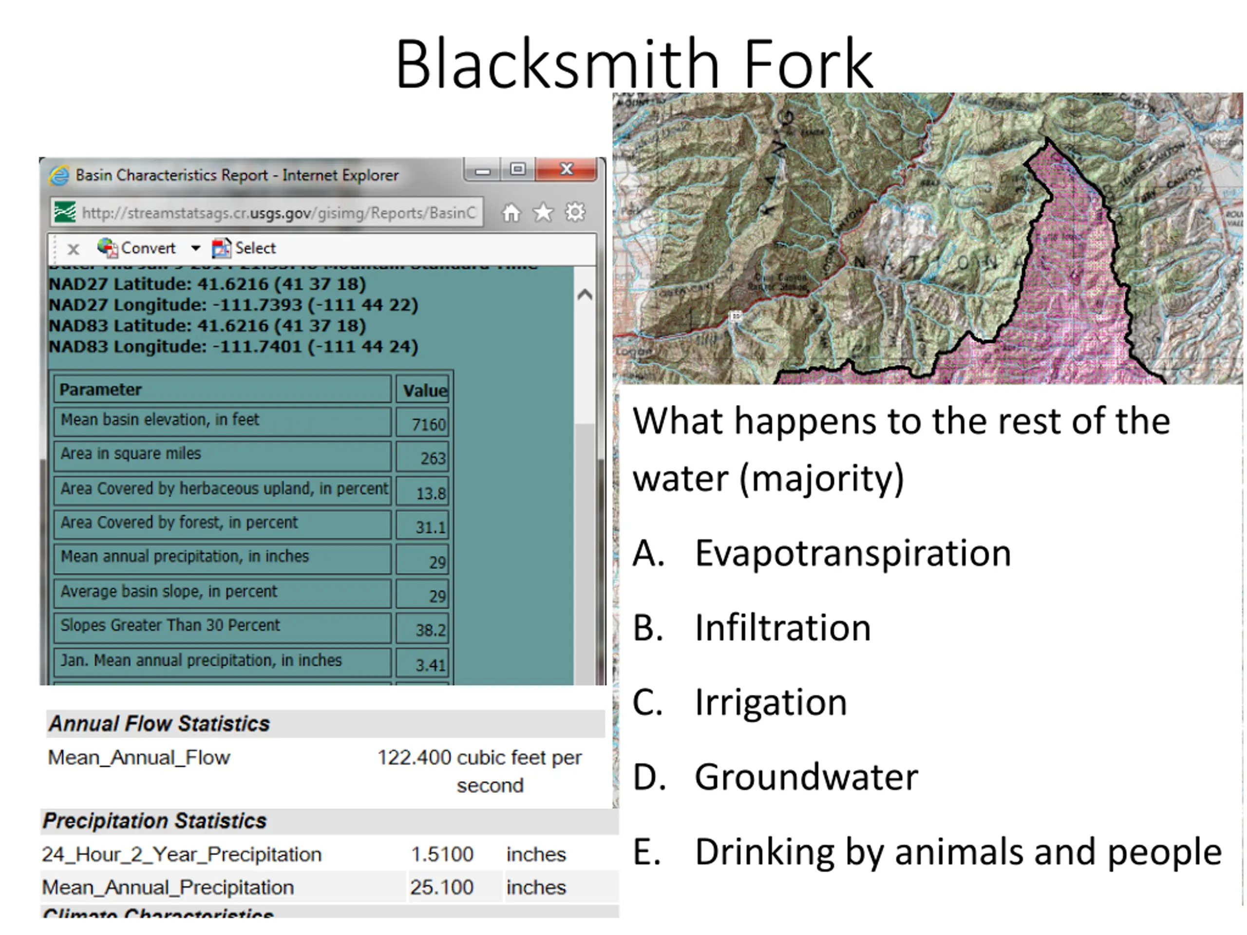 Blacksmith Fork What happens to the rest of the water (majority) A. Evapotranspiration B. Infiltration C. Irrigation D. Groundwater E. Drinking by animals and people
